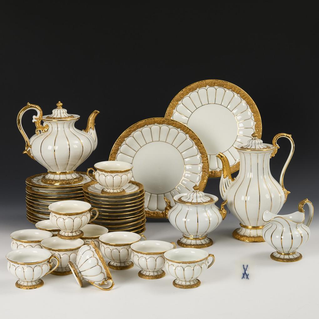 42 pieces. Coffee pot (h 26.5 cm), teapot (h 20.5 cm), milk jug, sugar bowl, 12 cups, 12 saucers, 12 breakfast plates and 2 cake plates (Ø 27 cm). Slip of the coffee pot chipped, sugar bowl hairline cracked, small chip to 1 cup handle.