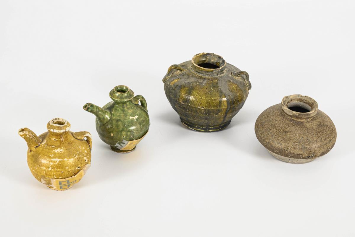 According to the available descriptions, this is: Sawanklalok ware 14th-15th century / Siamese (Thai) circa 14th-15th century / 4 pieces China, Sung-Yuan dynasty, 11th-14th century. One piece is missing a handle, otherwise the pieces are undamaged, only with traces of age.