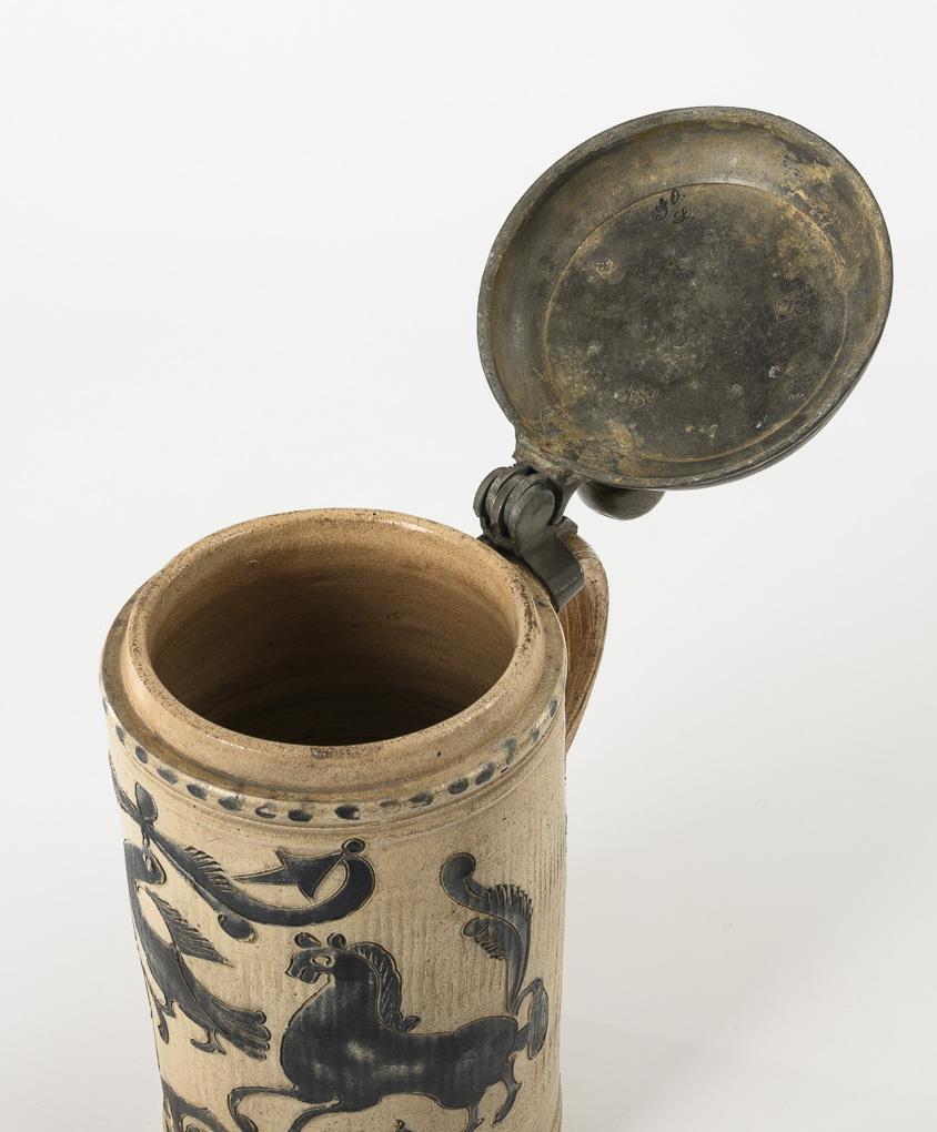 Westerwald roller jug with horses and birds.