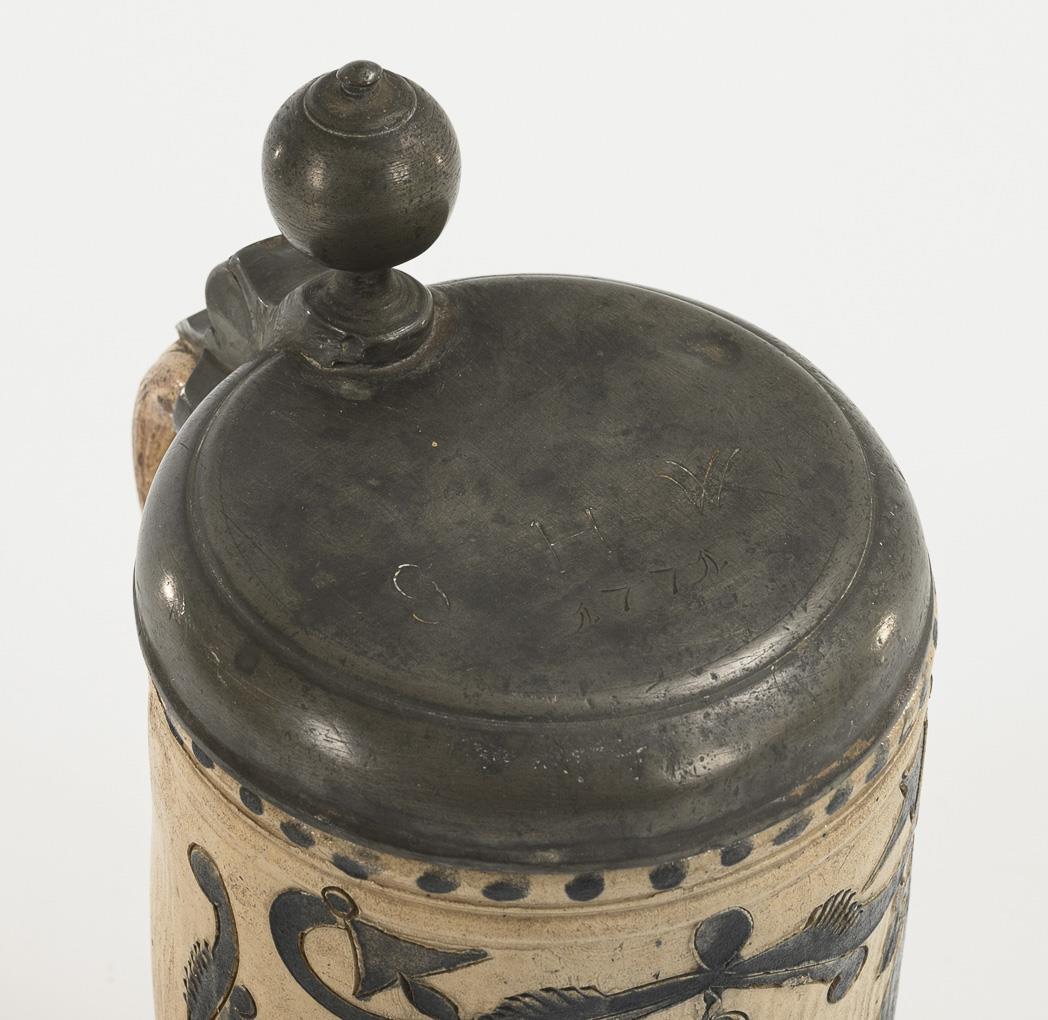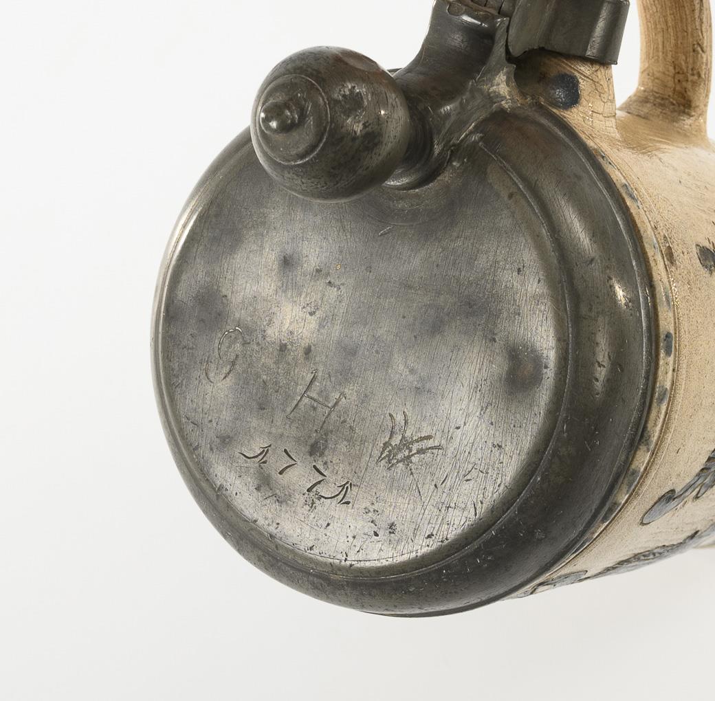 Cylindrical shape with pointed ear handle. Pewter lid with ball finial, engraved and dated "G.H.W. 1771", indistinctly hallmarked on the inside. Slight signs of age and use, old repair to the pewter lid.