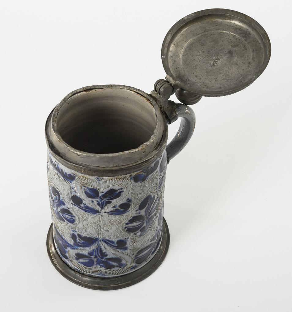 Cylindrical jug with pointed ear handle. Pearl-rimmed relief overlay with winged angel heads and flowering branches, surrounded by heart motifs in knibis technique and incised flowers with indented circles. Profiled pewter lid with ball finial, punched on the inside (Martin Edmann (ca. 1680-1745), master from 1714 in Bautzen), pewter strap on the neck, pewter stand ring. Jug with fine cracks on the base, pewter with major defects, additions, missing pewter band on the handle and signs of age.