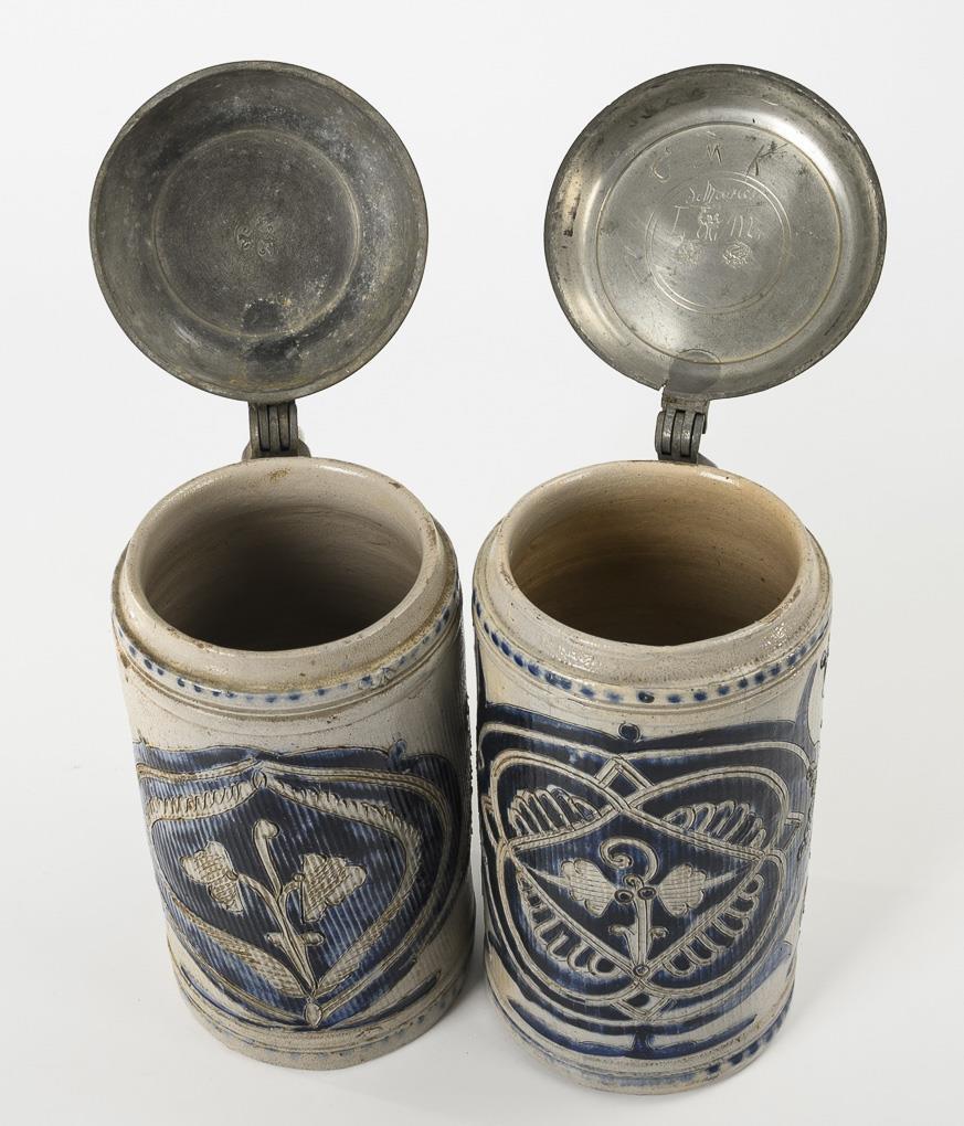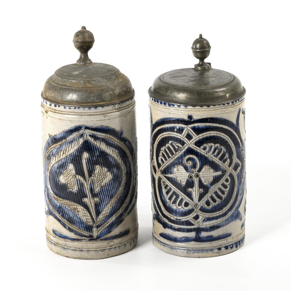 Grey, salt-glazed stoneware with incised and stamped decoration, cobalt blue painting and dotted decoration. H 25 and 27 cm.