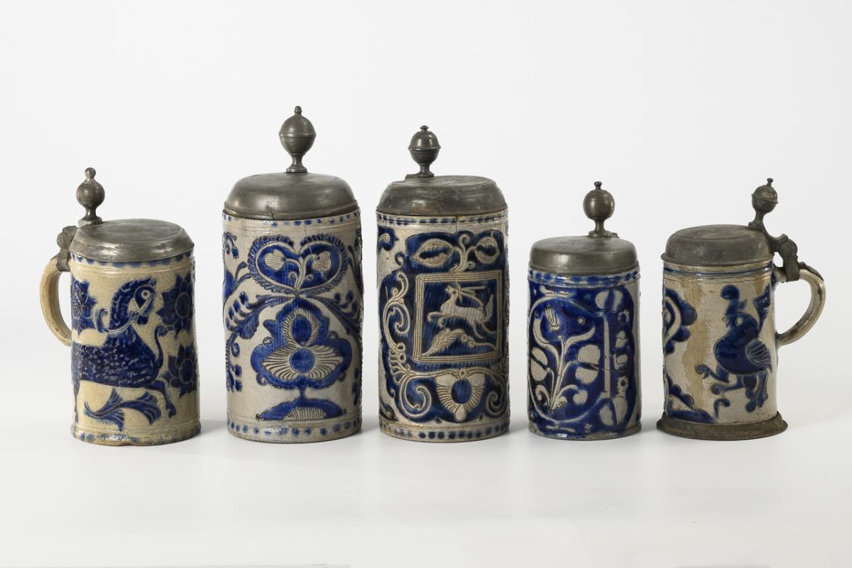 5 defective Westerwald roller jugs with various animal and plant motifs.