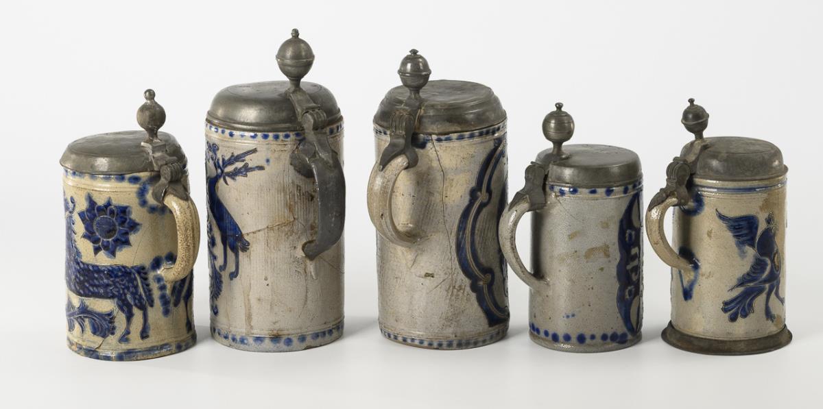 5 defective Westerwald roller jugs with various animal and plant motifs.