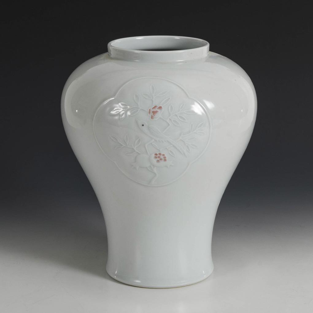 Baluster vase with white glaze. Two bas-reliefs depicting birds, with subtle red coloring of the peony blossom and the pomegranate.