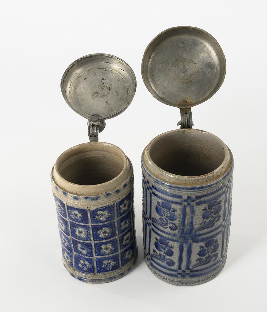 Grey, salt-glazed stoneware with incised and stamped decoration, cobalt blue painting and dotted decoration. H 20 and 20.5 cm.
