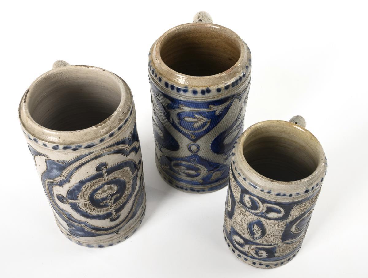 Grey, salt-glazed stoneware with incised, model and stamped decoration, cobalt blue painting and dotted decoration. H 16 to 20 cm.