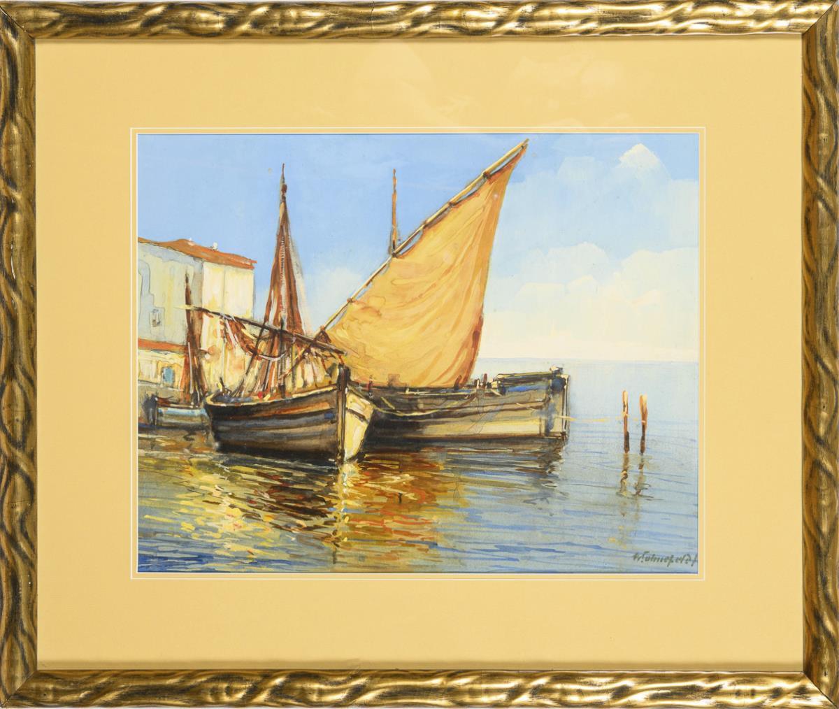 The boats in the sunshine on the jetty in front of the houses with a view of the open sea.