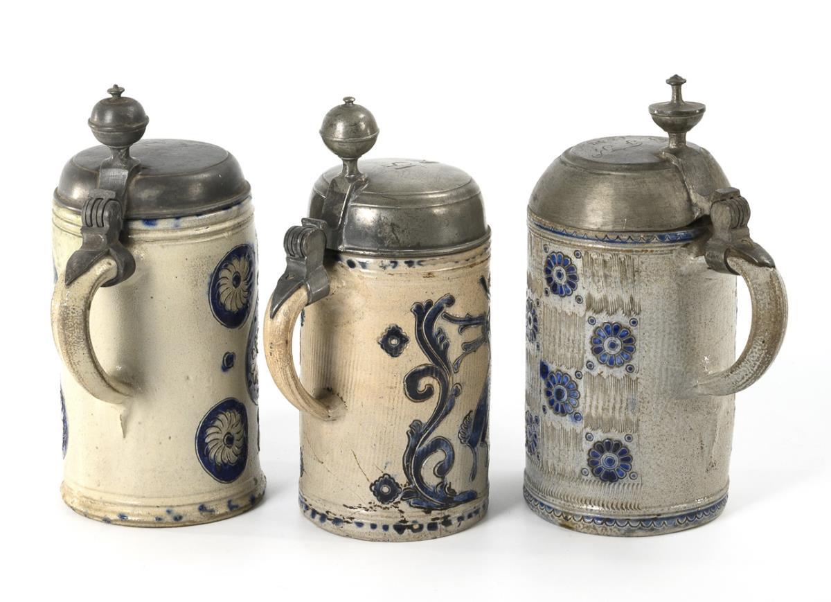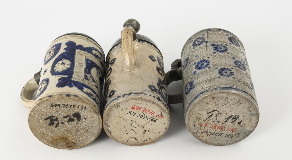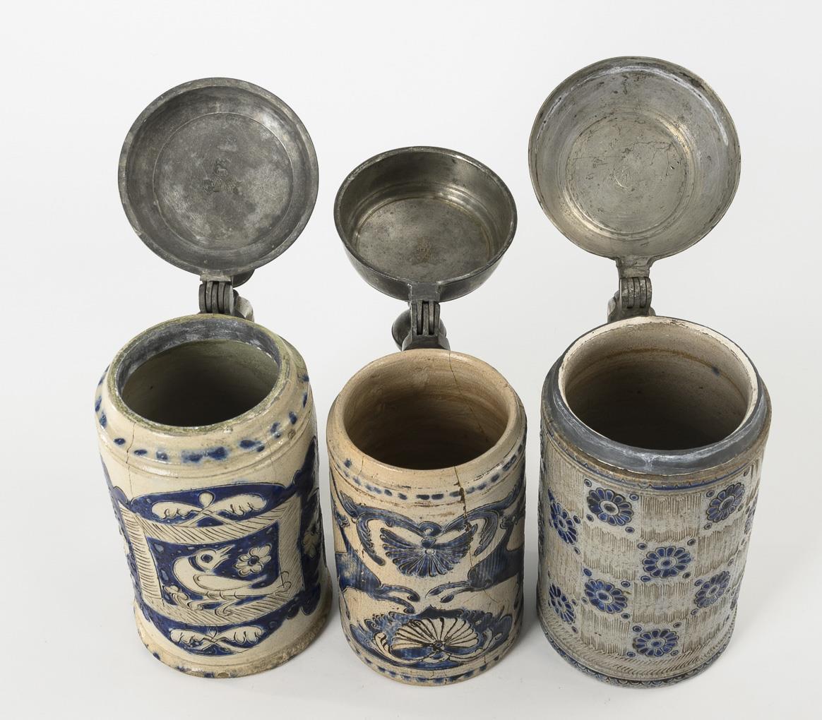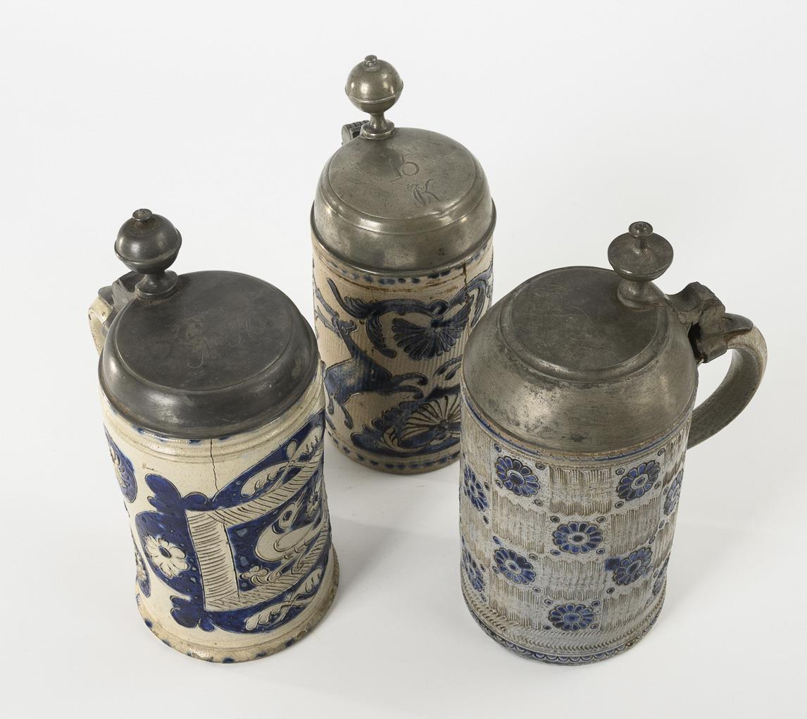 Cylinder jugs with tapered ear handles. 1x rectangular reserve with bird and flanking rosettes, 1x leaping stags and fan leaf decoration, 1x chequered pattern with rosettes and combed incised fields. Each with engraved pewter lid and ball pusher, hallmarked inside. With defects, partly restored, signs of age and use.