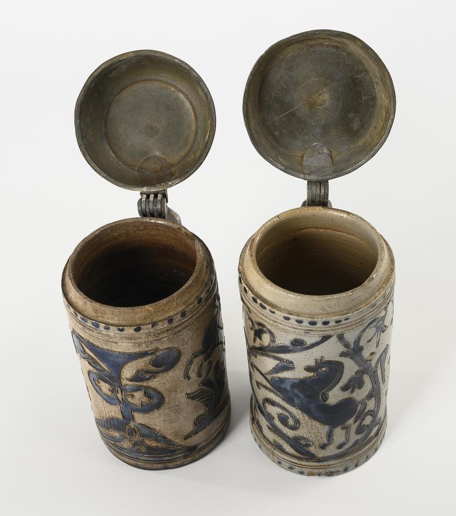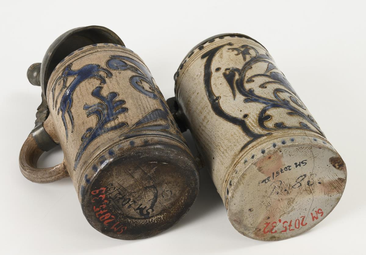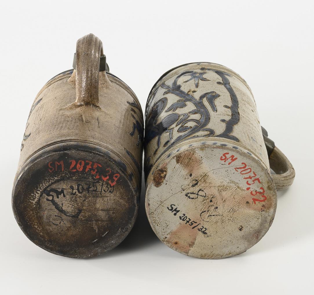 Grey, salt-glazed stoneware with incised and stamped decoration, cobalt blue painting and dotted decoration. H 22.5 and 23 cm.