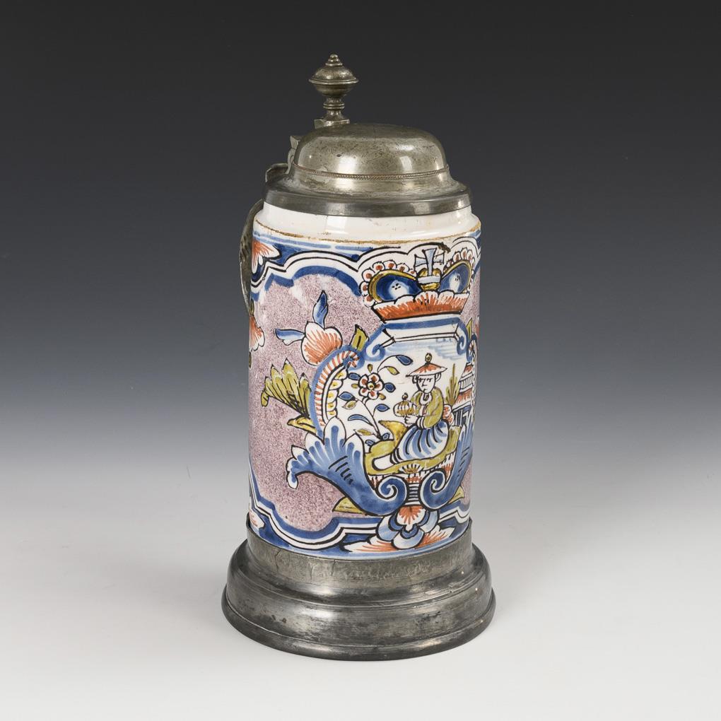 Cylindrical body with manganese-painted walls, a crowned cartouche on the front with a seated Asian in a landscape with architecture. Replaced pewter lid with ball finial, replaced pewter handle, loose pewter stand. Fine crack in the mouth area, glaze and rims slightly rubbed.