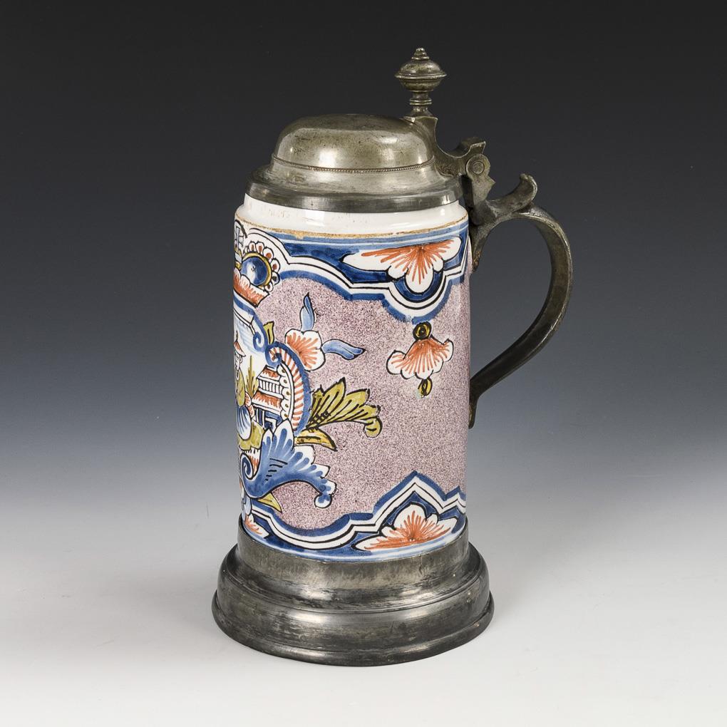 Cylindrical body with manganese-painted walls, a crowned cartouche on the front with a seated Asian in a landscape with architecture. Replaced pewter lid with ball finial, replaced pewter handle, loose pewter stand. Fine crack in the mouth area, glaze and rims slightly rubbed.