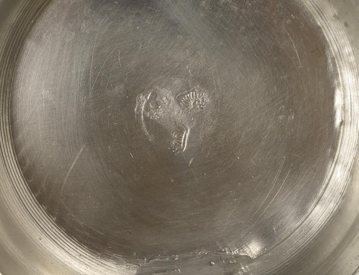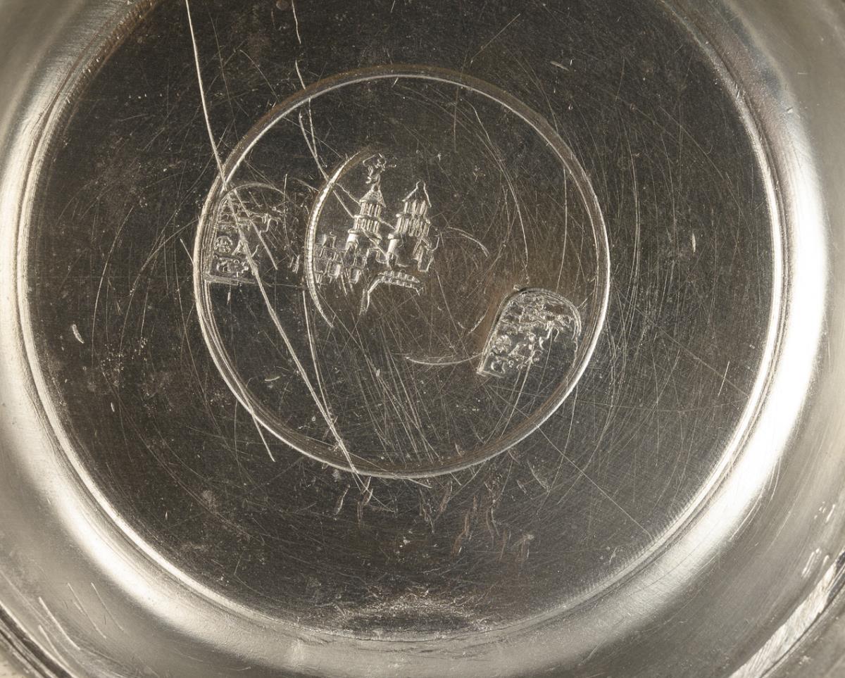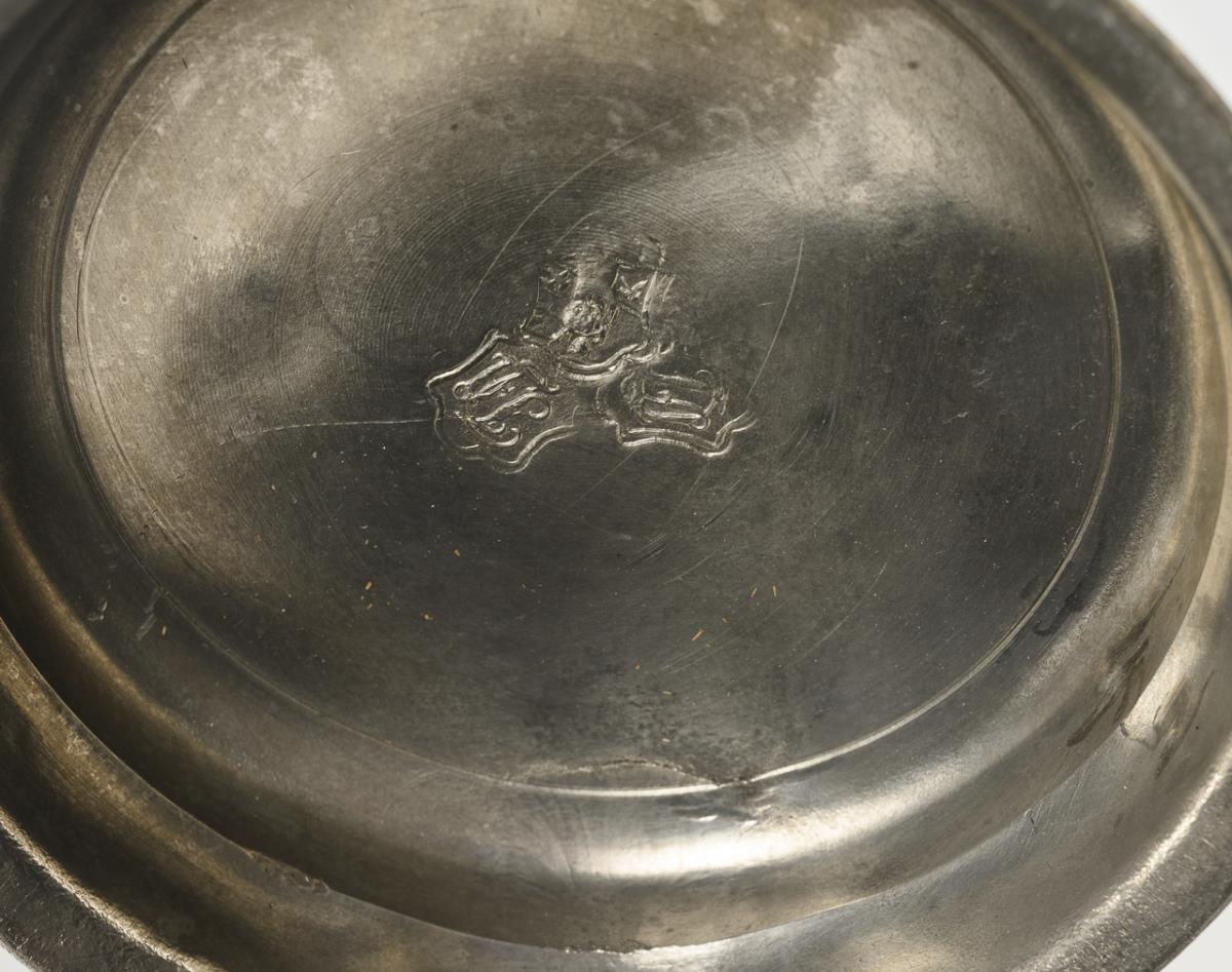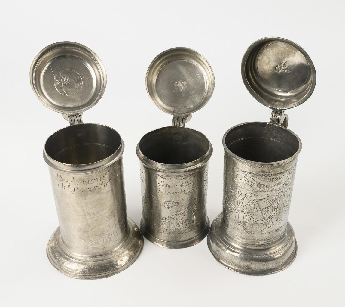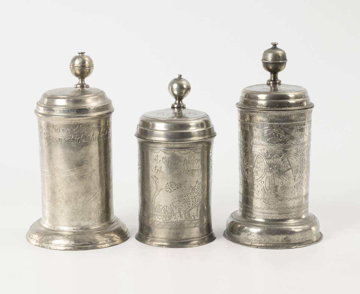 Jug with alliance coat of arms and motto on Saxony, engraved lid "H.D.G. 1808". / Jug with plowing farmer and motto, engraved on the lid "IGM 1791". / Similar depiction on the jug with narrow foot and engraved lid "E.M.F.B. 1796". Each restored and polished, 1 minimal hairline crack in the wall, traces of age/use on each.