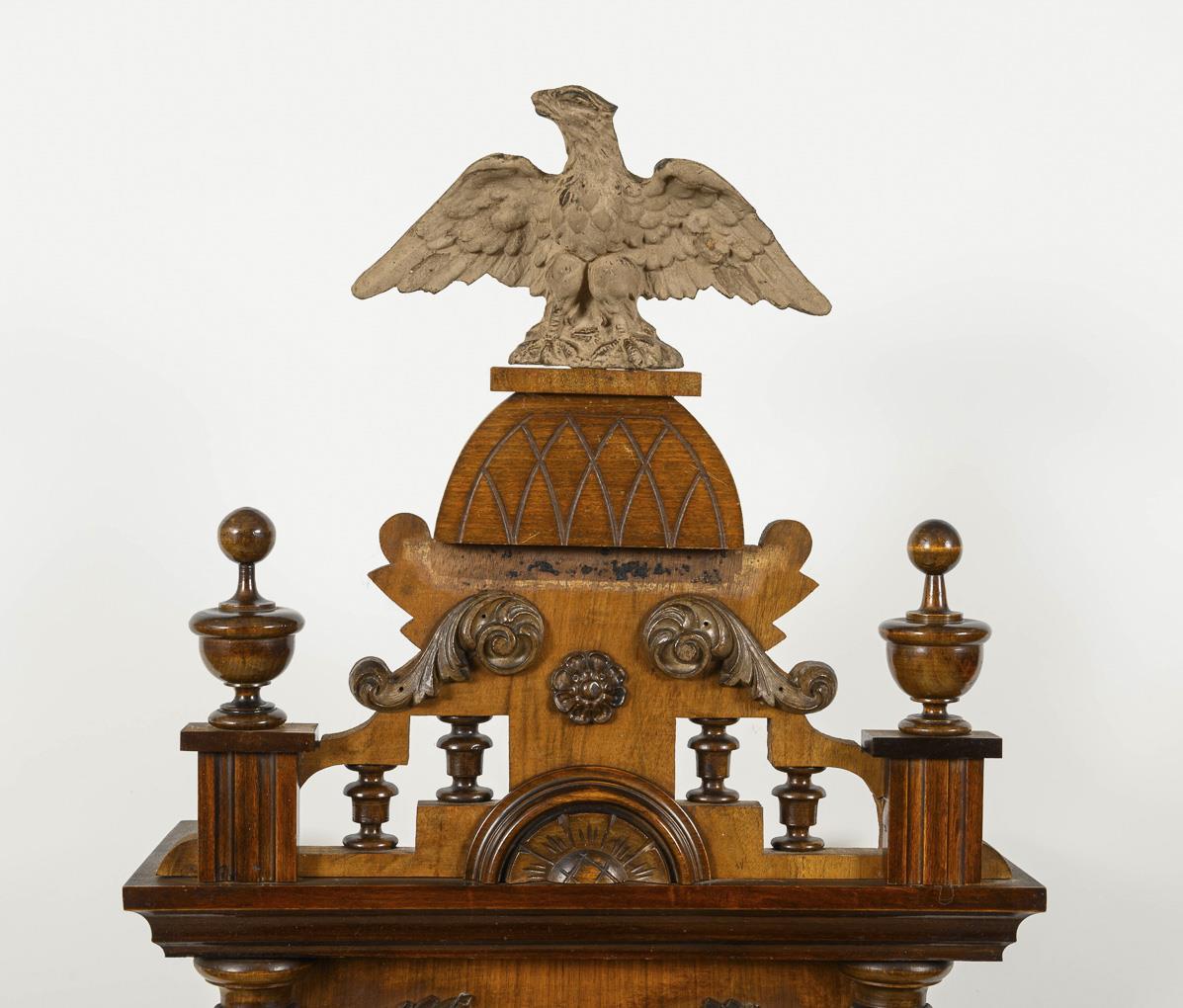 Wall clock with architectural design, crowned eagle finial, curved console board, decorated with turnery and carvings typical of the period. Signs of age and wear, with defects and missing parts.