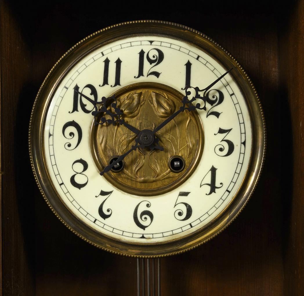 Marked movement with half-hour strike on gong. Not running, in need of revision. White enamel chapter ring with Arabic numerals, minute ring and pierced hands, an Art Nouveau floral motif in relief in the center of the dial.