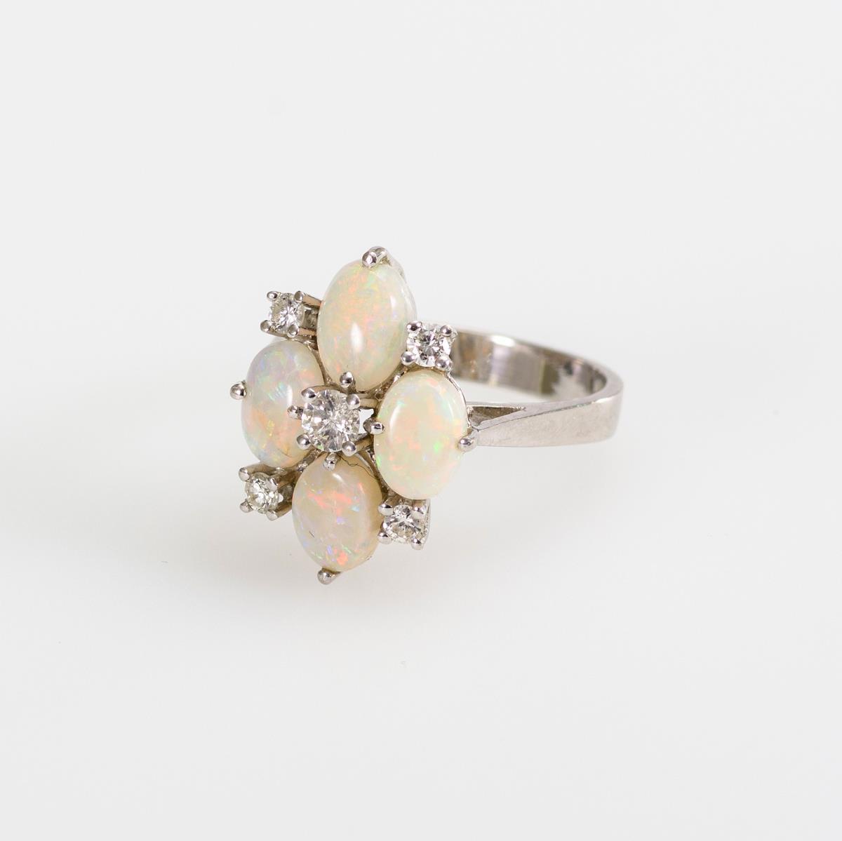 585 WG. 5,0 g. 4 Opalcabochons (zus. ca. 1,20 ct) zwischen 5 chatongefassten Brillanten (zus. 0,30/ I-J/si-PI), auf gestegtem Unterbau. Mittlere Schiene. Ý 18 mm/Rg 57. G Wertermittlung laut Gutachten von 2017: 2.750,00 Euro..