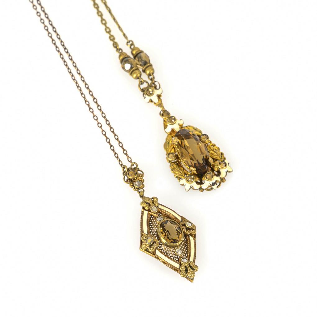 Relief ornamental pendants with imitation bezel-set and claw-set decoration, partially enameled, between decorative chains with screw clasps. 1 small enamel flaw.