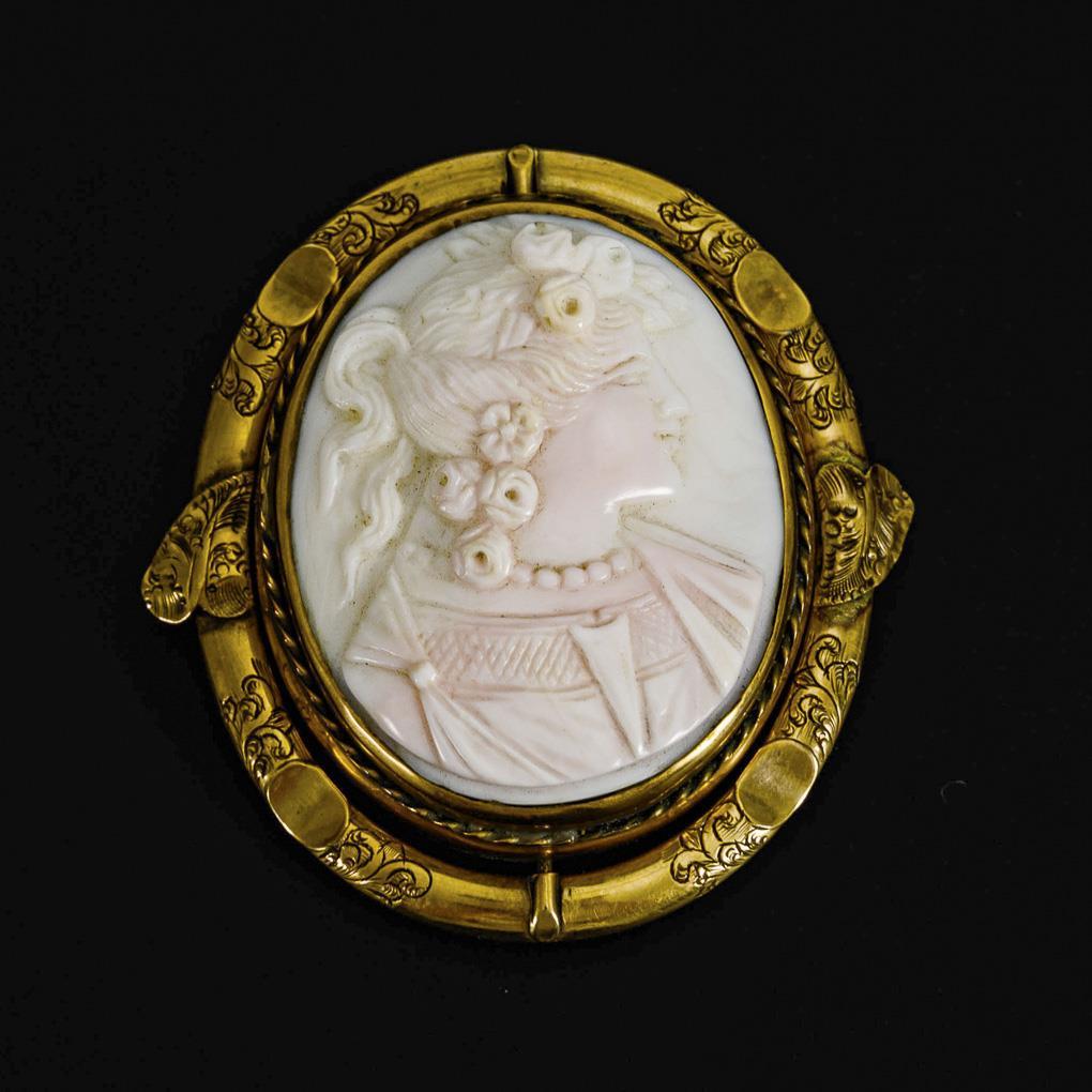 Coral cameo with antique-style cut profile head in flora type in bezel setting with cord edge, glazed and framed on the back (rotatable in frame), decorated foam gold frame in hollow form. Hook clasp.