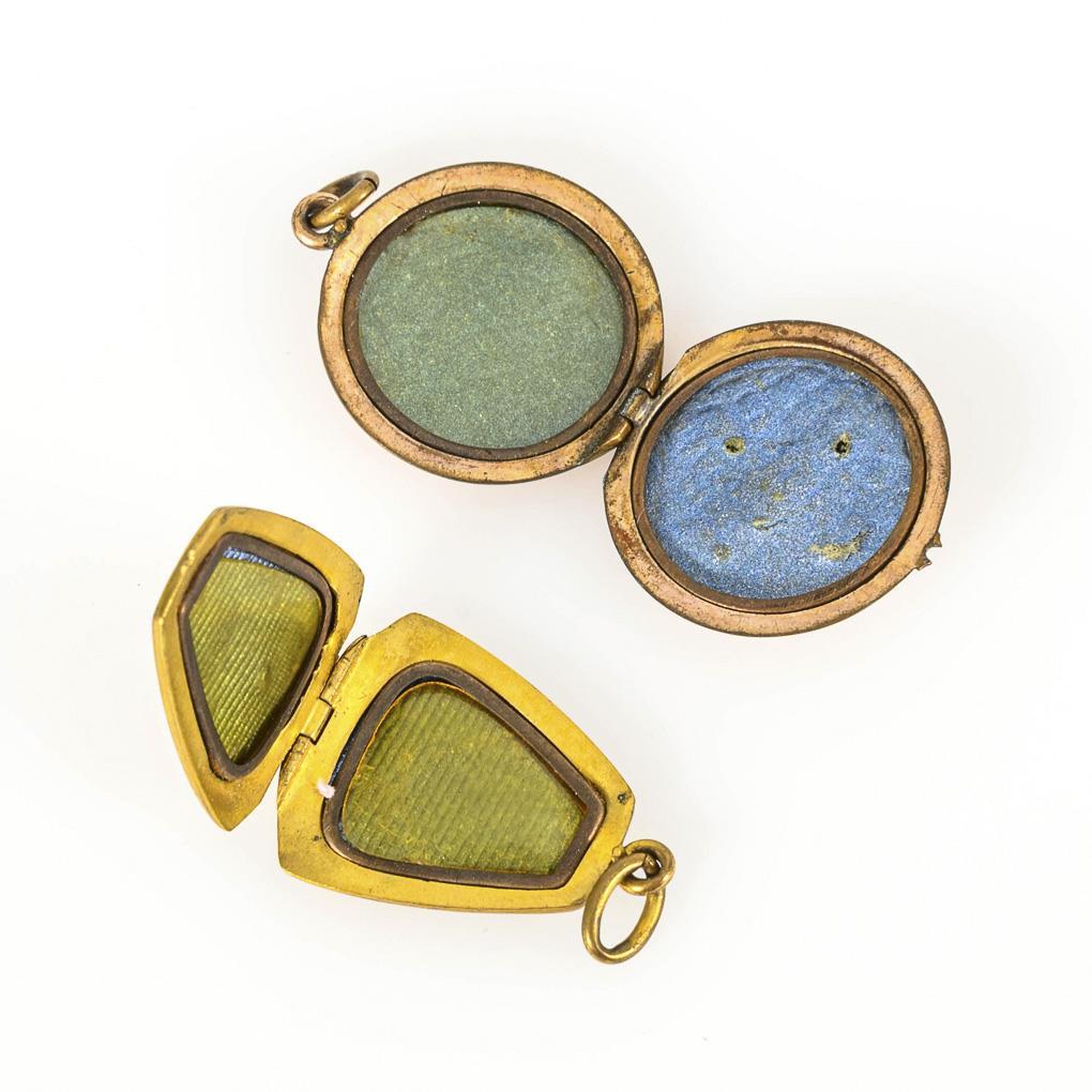 2 medallions decorated on the front with 2 framed inner compartments and 1 pendant. 1 small cabochon missing.