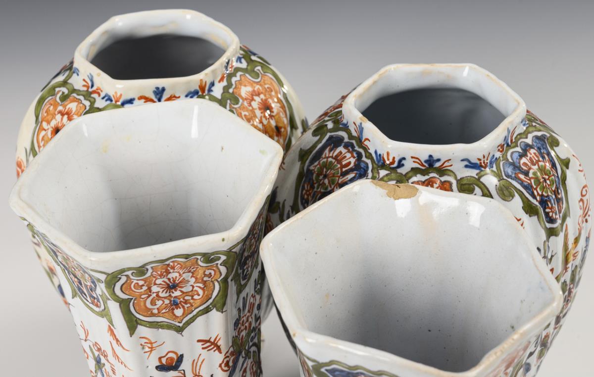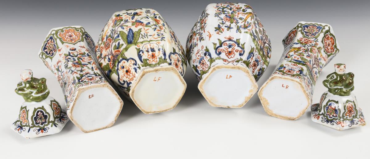 A pair of lidded vases with lion finials (h 27 cm), a pair of flute vases with six-panel and ribbed walls (h 18 cm). Multicolored floral chinoiserie decoration with flowers and birds. Slight signs of age and wear, partial defects.