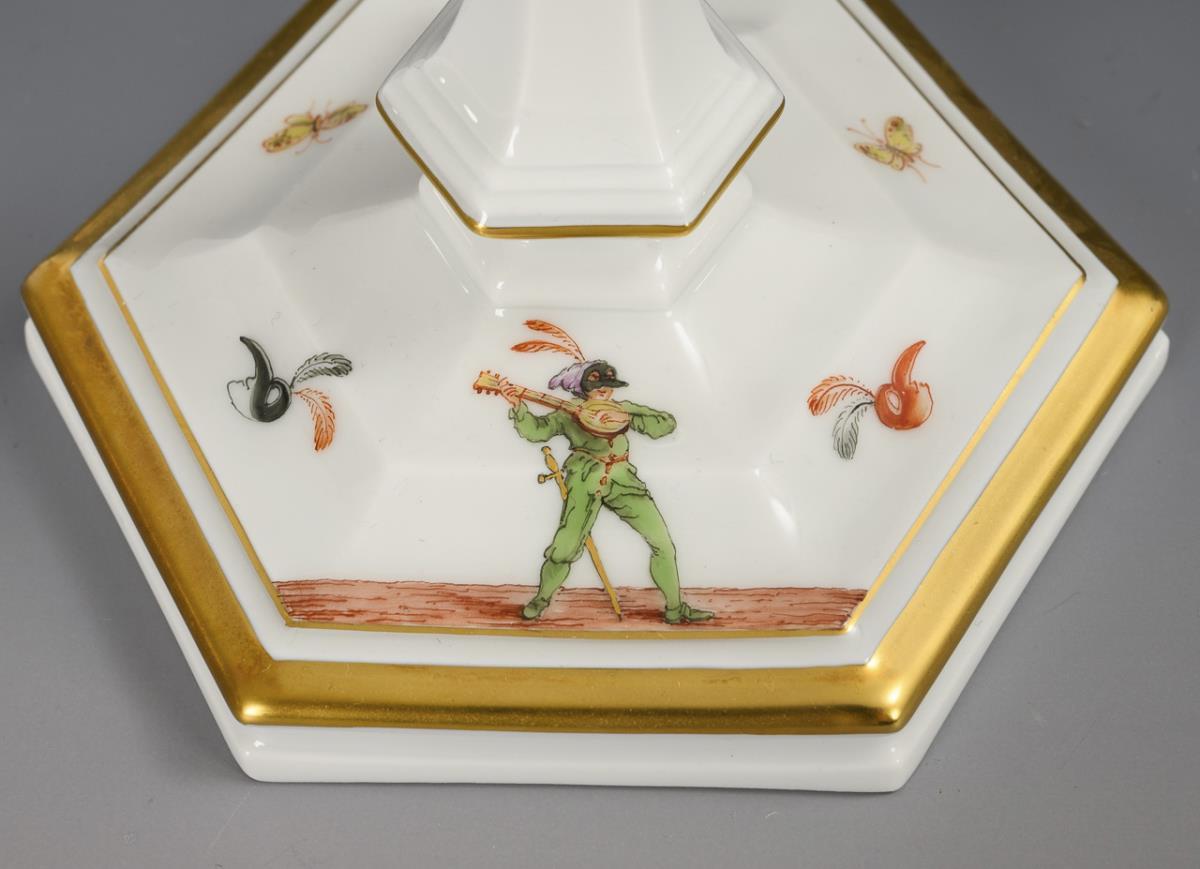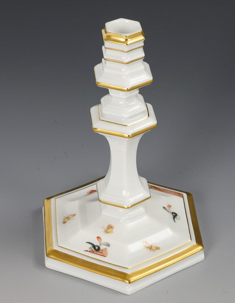 Hexagonal candlestick with multi-jointed shaft. Painted with a figure after the Italian Commedia dell'arte as well as with masks and insects.