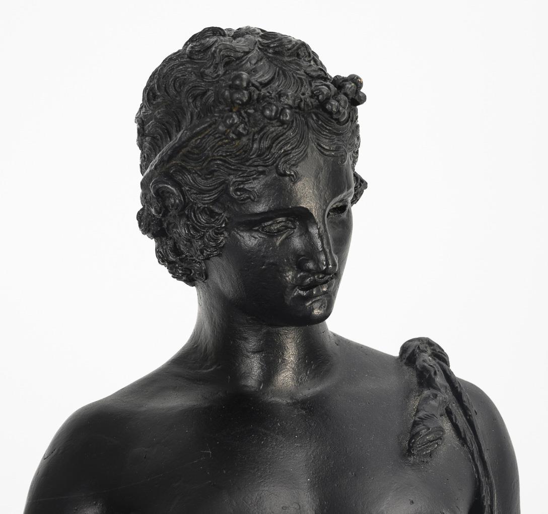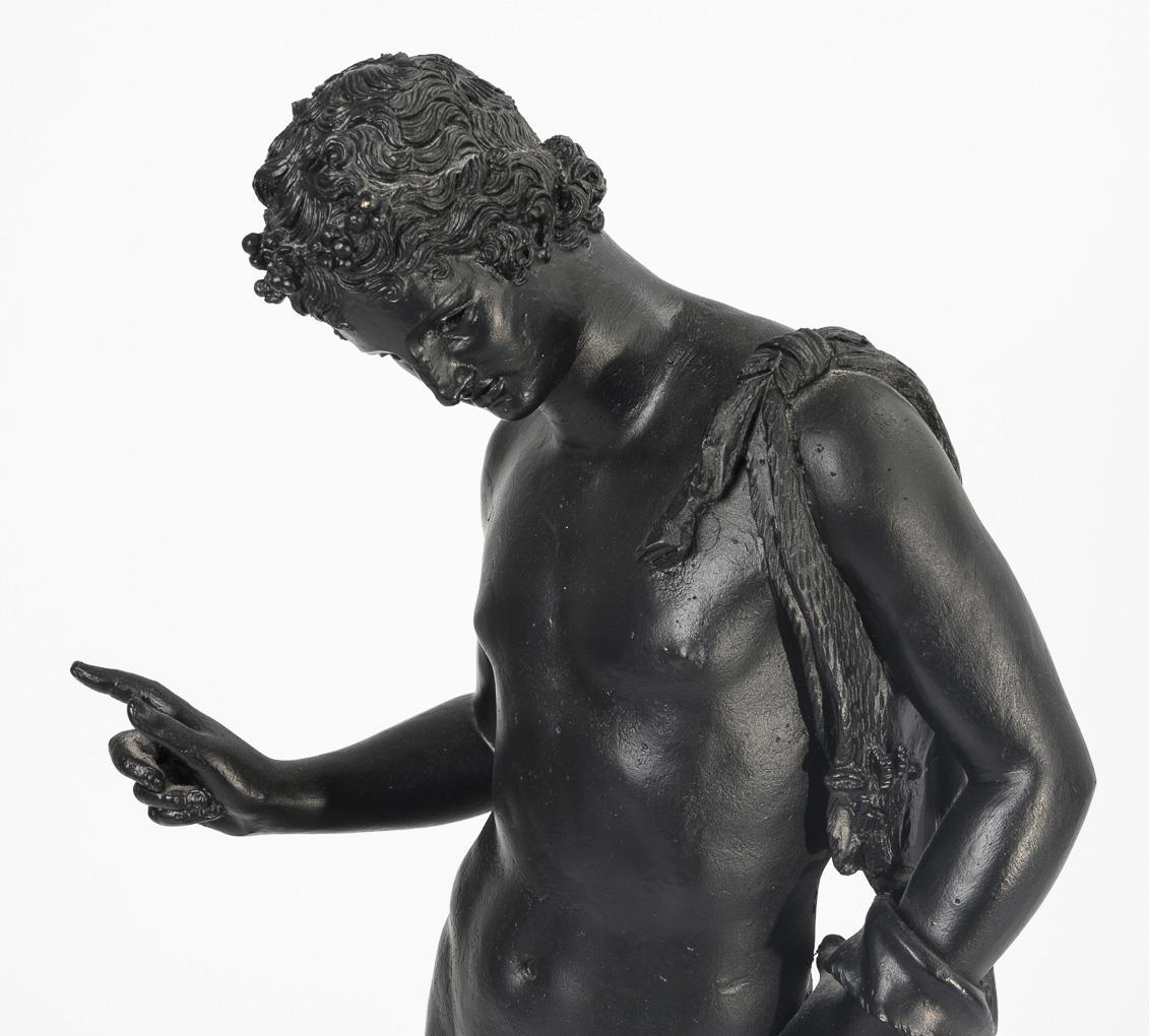 Nude god of wine (Roman Bacchus) with Nebris over his shoulder, modeled after the ancient standing figure from Pompeii. The original is now in the National Archaeological Museum of Naples. Minor casting defects.