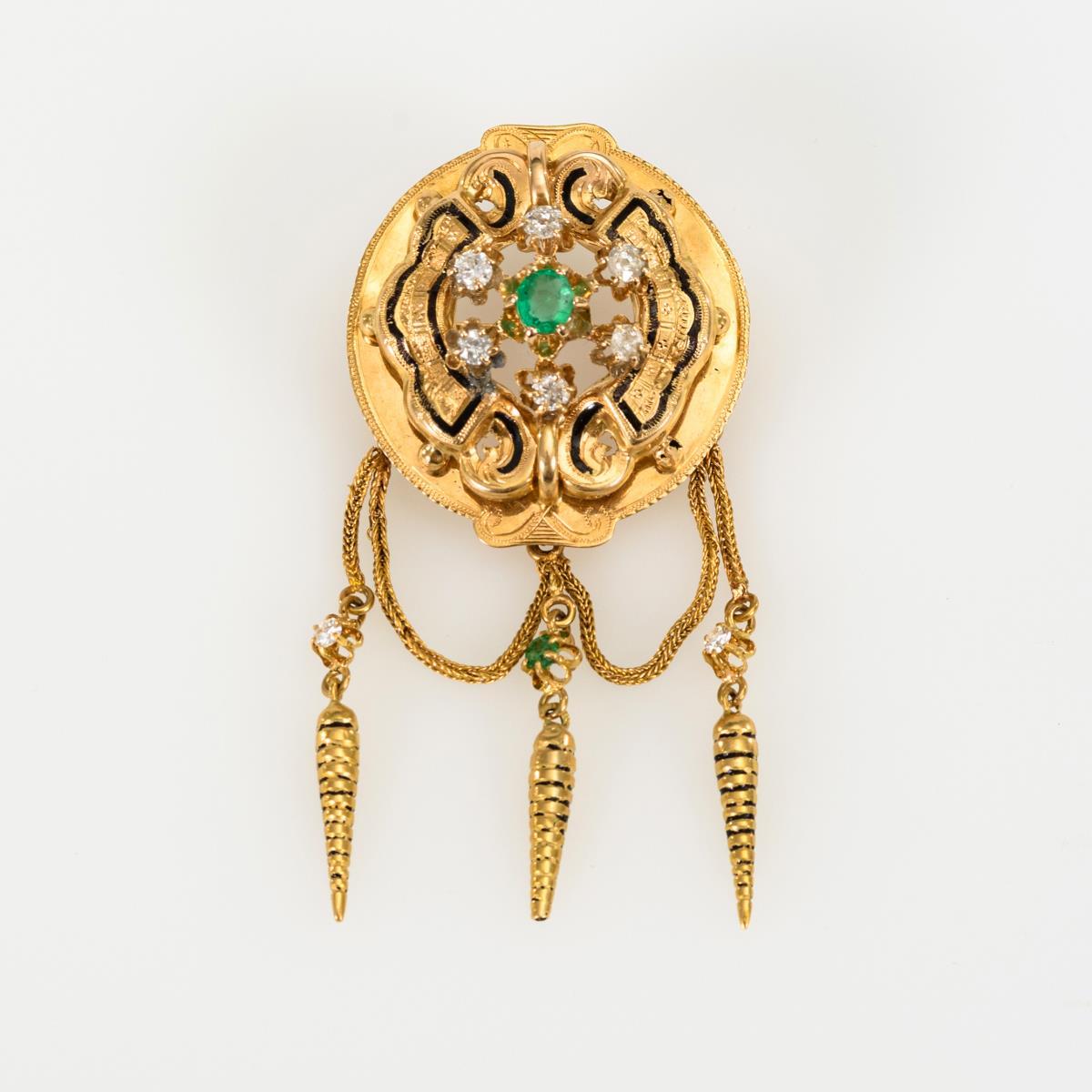 Historismus-Brosche/Anhänger mit Altschliff-Brillanten und Smaragden.