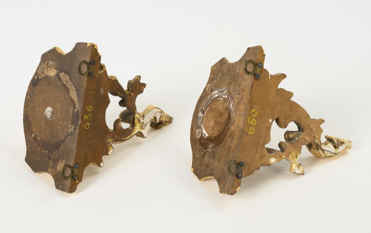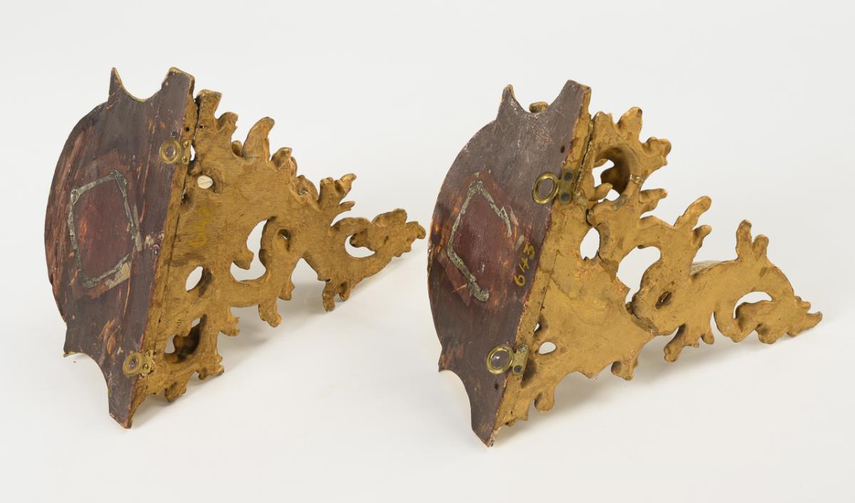 Curved bracket boards supported by filigree acanthus. Je glued and partly over-bronzed, traces of use on the bracket boards.