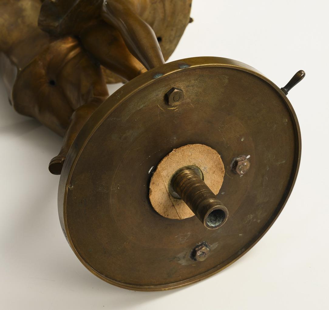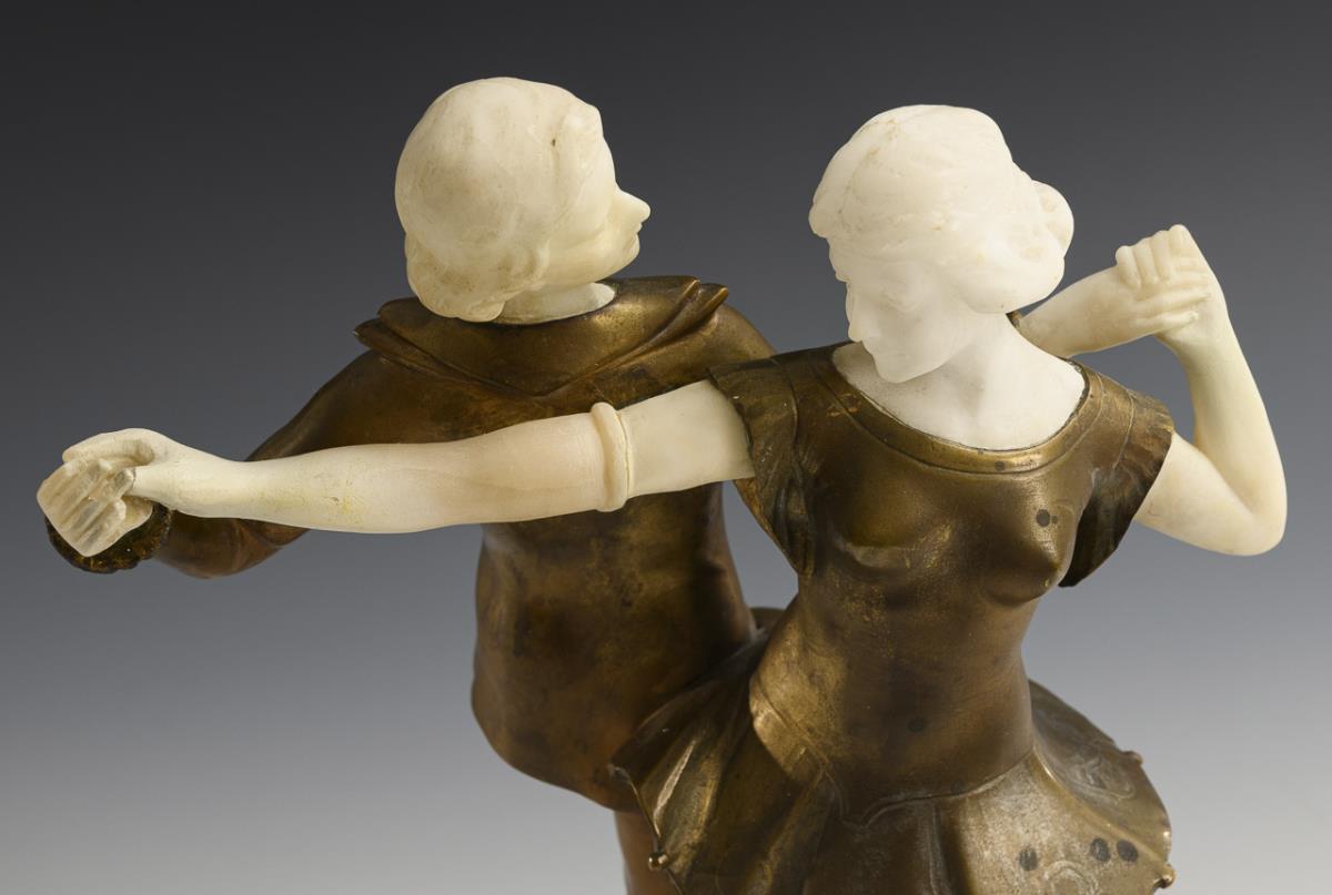 Elegant dancing couple on the rotating plinth, which can thus be viewed from all sides. 1 finger missing, 2 hands restored, traces of glue on the alabaster, bronze patina partly tarnished.