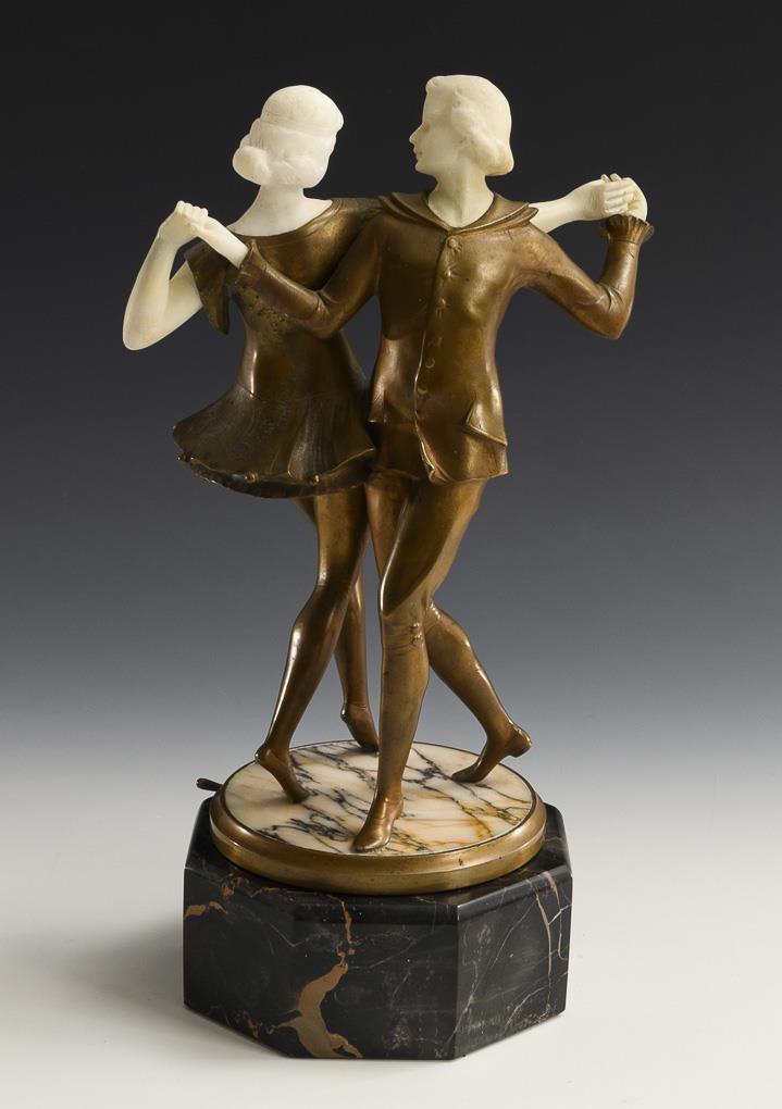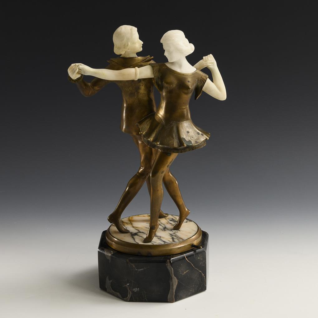 Elegant dancing couple on the rotating plinth, which can thus be viewed from all sides. 1 finger missing, 2 hands restored, traces of glue on the alabaster, bronze patina partly tarnished.
