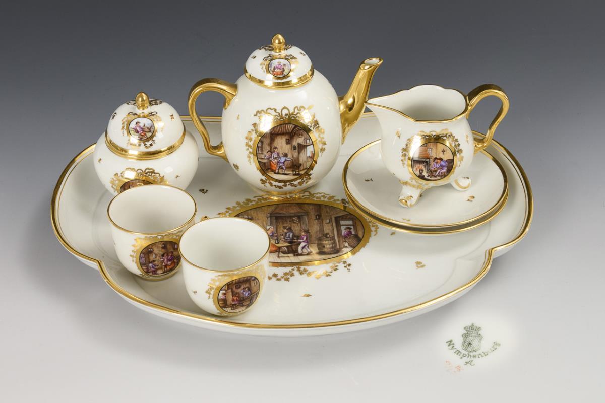 8 pieces. Depiction of tavern scenes in gold-framed medallions. Demitasse pot (H 11.5 cm), milk jug, sugar bowl, 2 demitasse cups with 2 saucers and tray (L 33 cm).