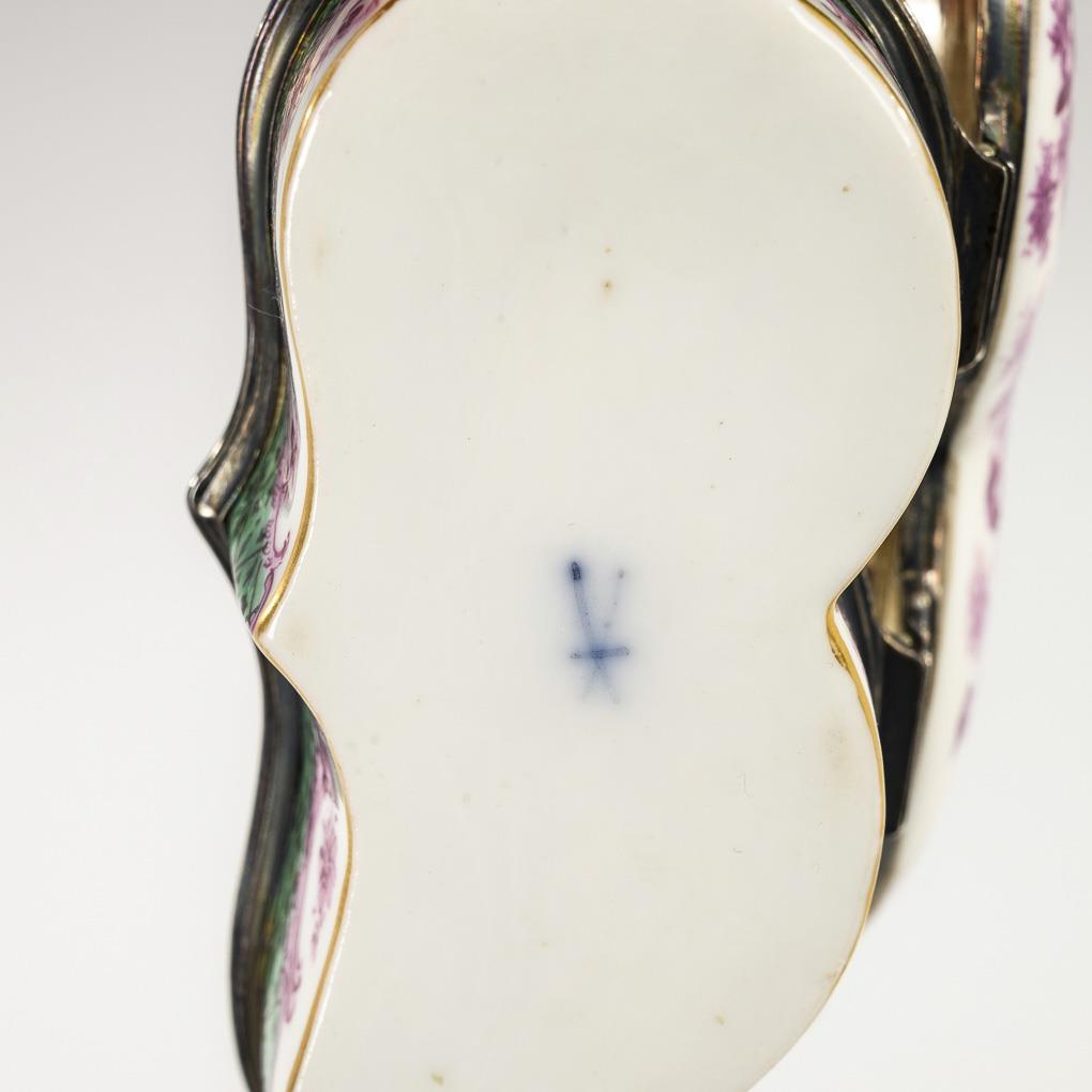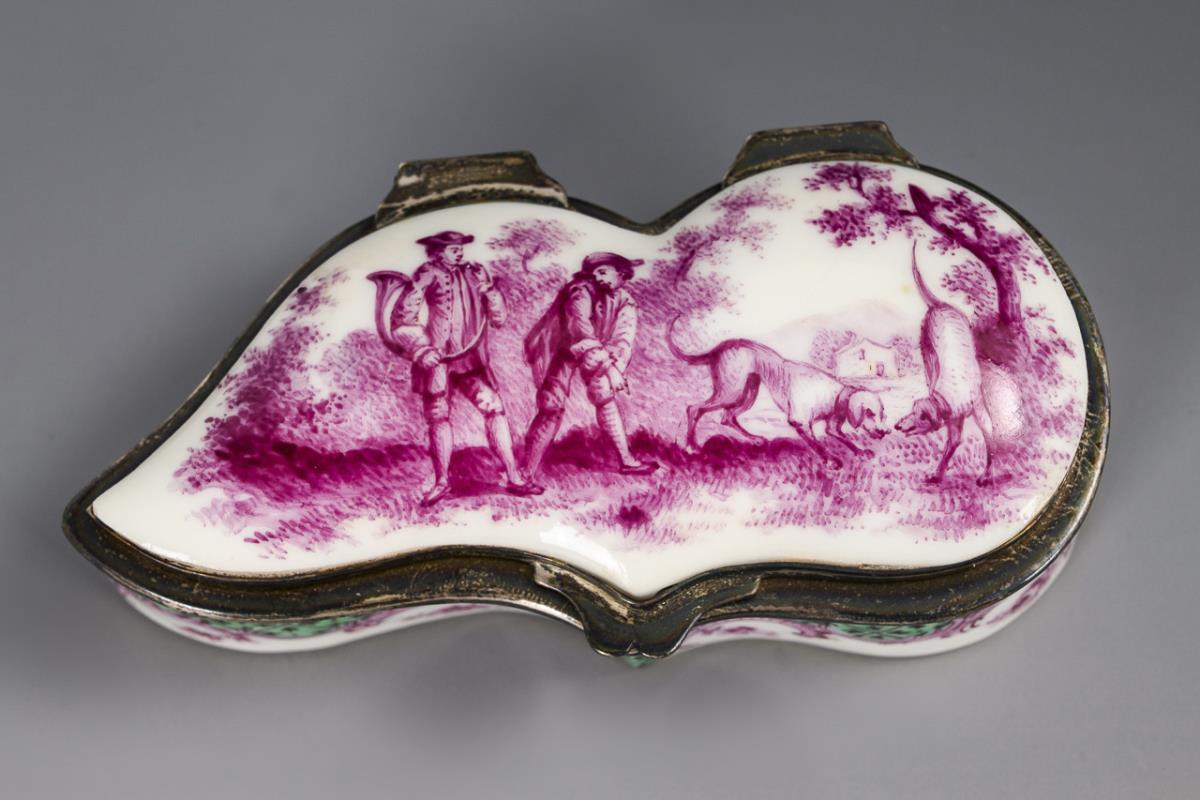 Irregularly shaped box with silver-mounted hinged lid (not hallmarked, silver tested). On the lid the purple-painted depiction of two hunters with two hounds, on the wall green mosaic border with purple rocailles.