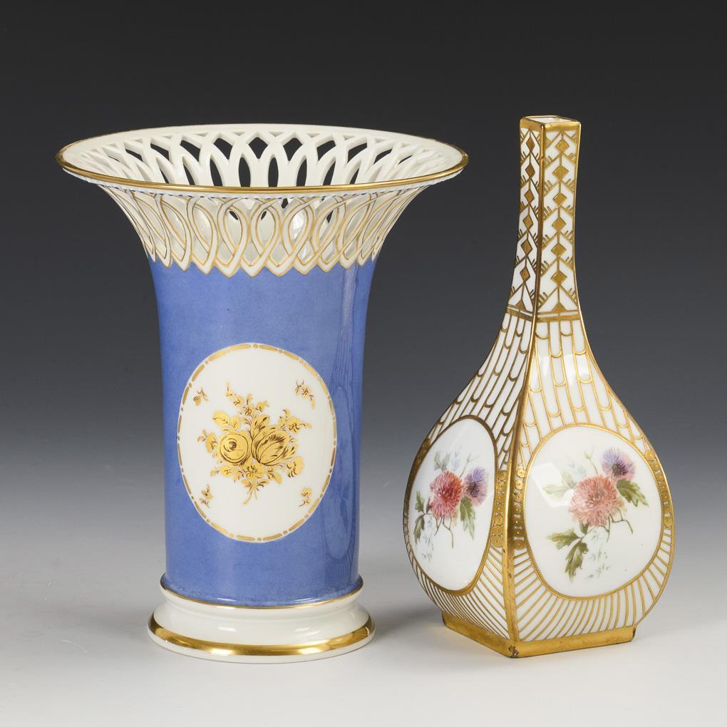 1x crater vase with pierced rim, blue ground and gold flower painting (H 20 cm). / 1x square narrow-necked vase with ornamental bronze overlay and floral decoration (H 21.5 cm).