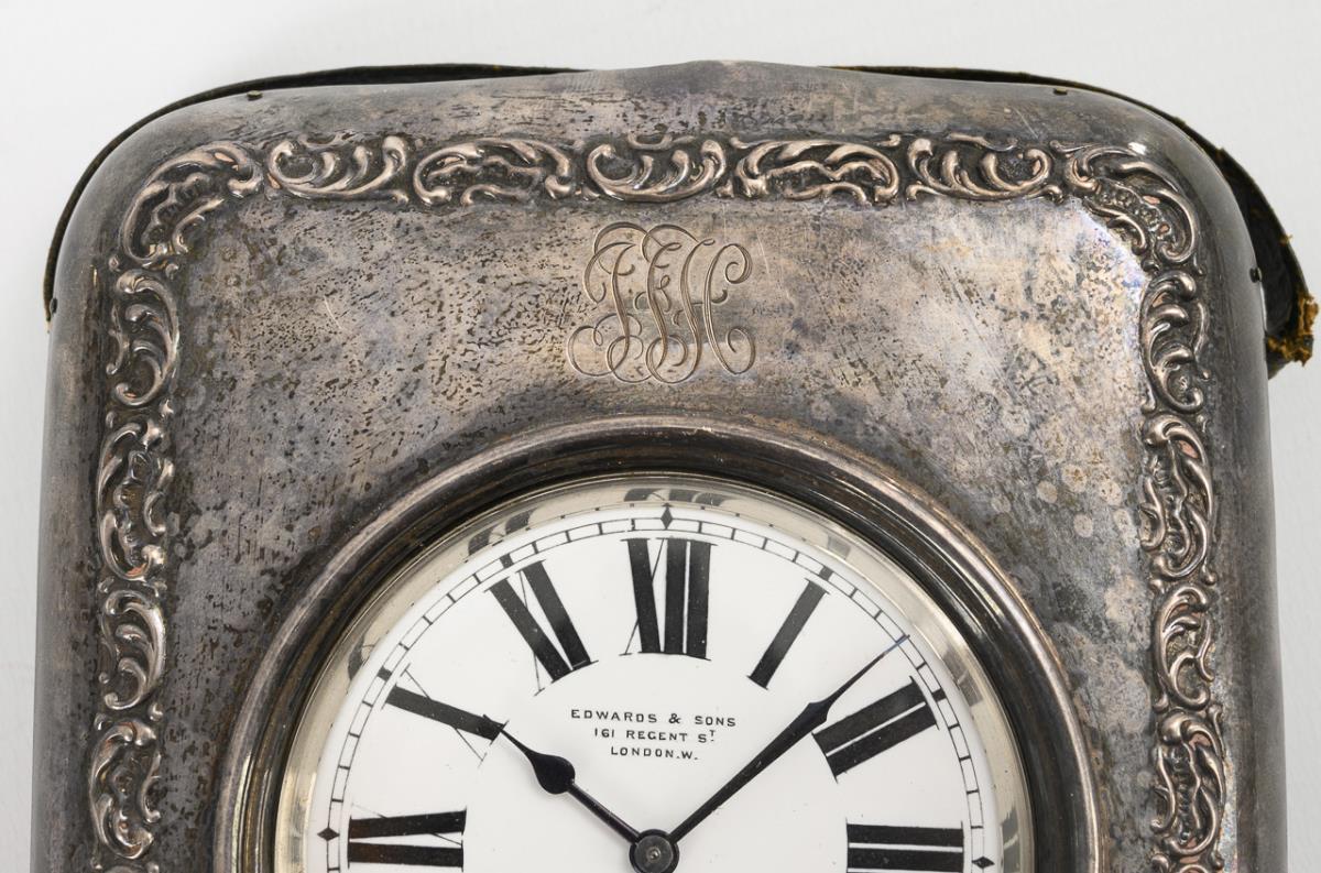 Smooth chrome watch case with round bow. Hinged case with silver front in floral relief and ligated monogram engraving, embossed moss green cover on the back with carrying handle and stand, inside lined in velvet green. Signs of age and wear, case with light scratch marks in places.
