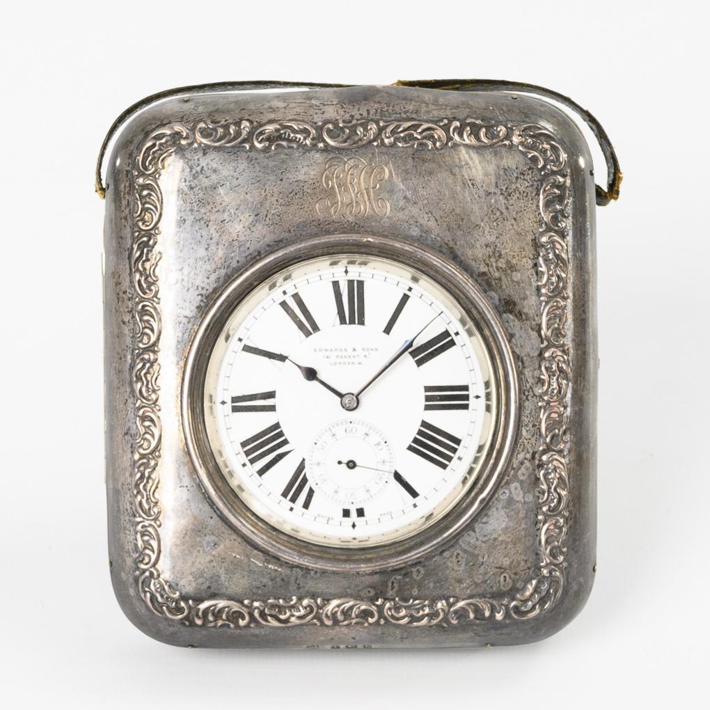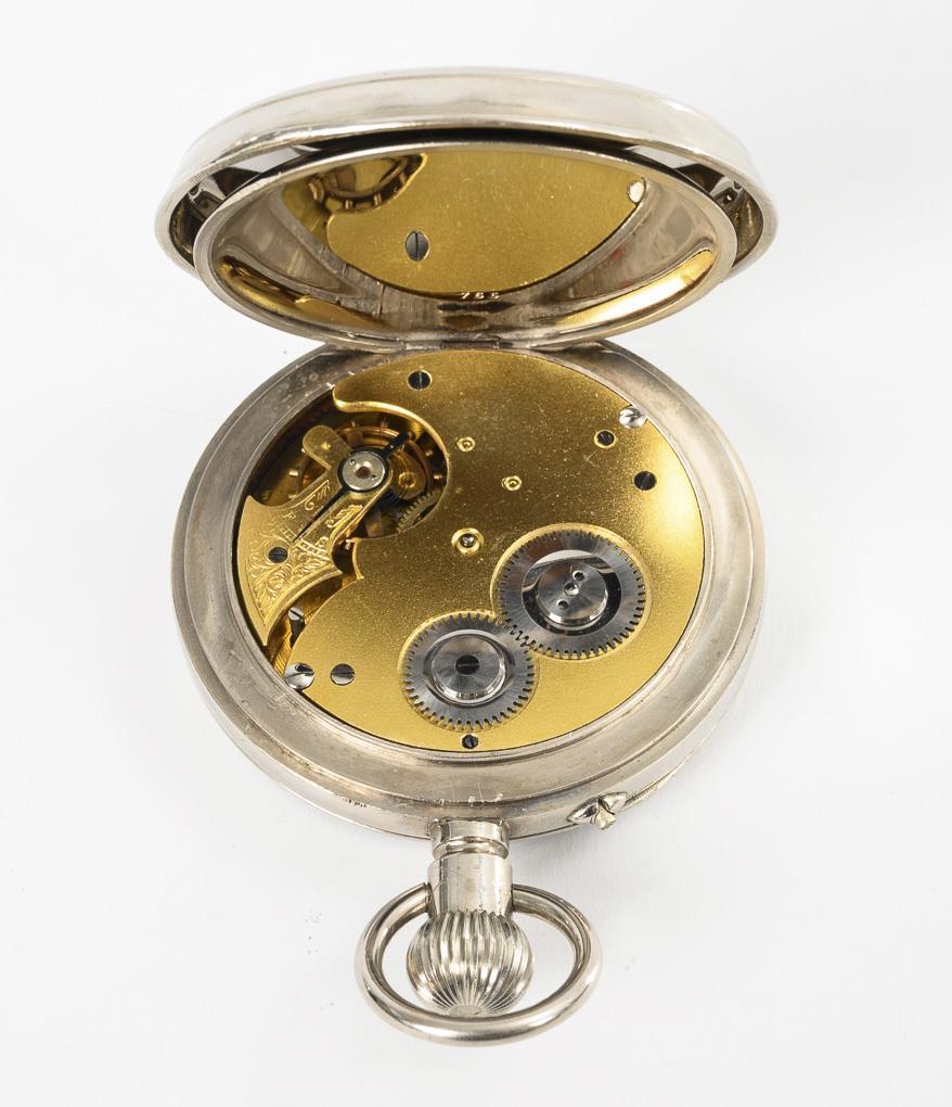 Silver hallmarked with Birmingham city mark/striding lion/year letter h (1907), master's mark Synyer & Beddoes. Ø 6.7 cm. Watch 192 g, total weight 290 g.