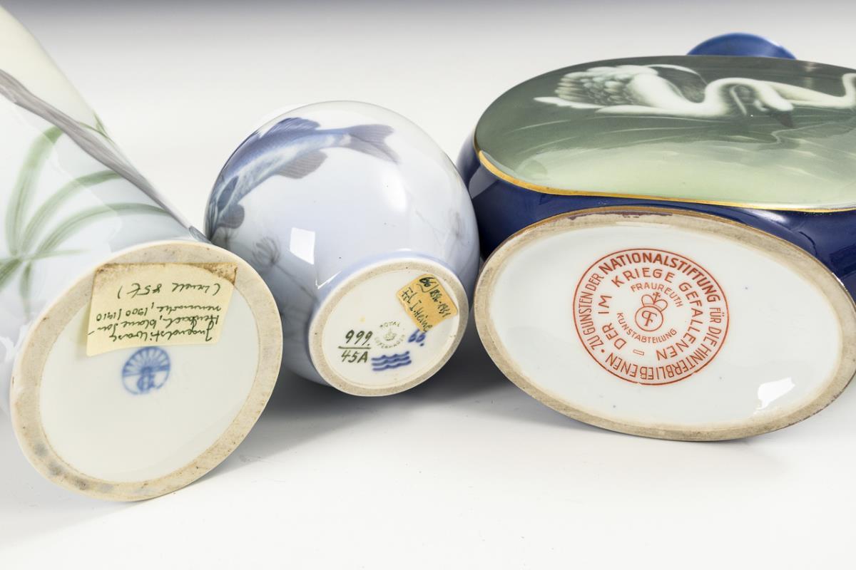 1x HEUBACH: Baluster vase with pair of birds (h 27 cm). / 1x FRAUREUTH: Baluster plate vase with pair of swans (H 20 cm). / 1x ROYAL COPENHAGEN: small baluster vase with fish (H 10 cm).