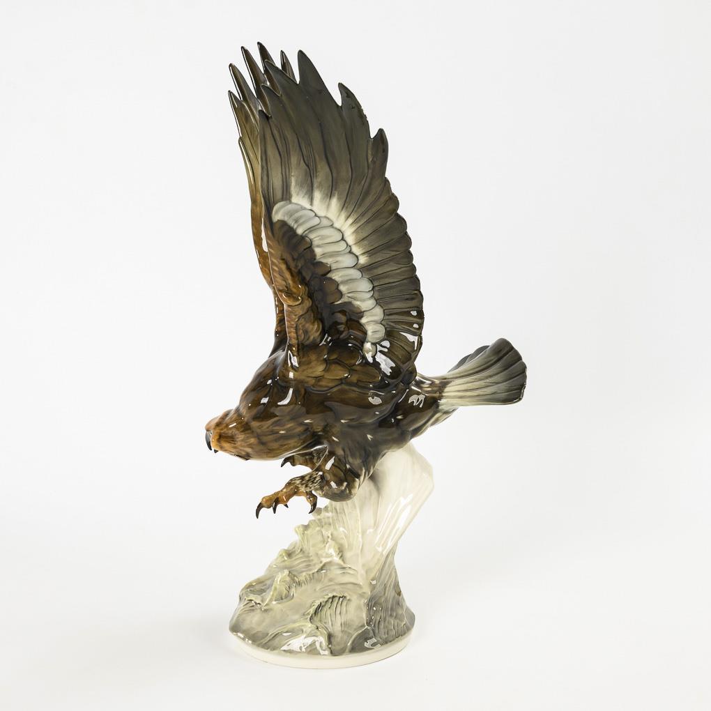 A sea eagle flying over moving water. 1 claw glued, 1 claw tip minimally bumped, left wing restored.