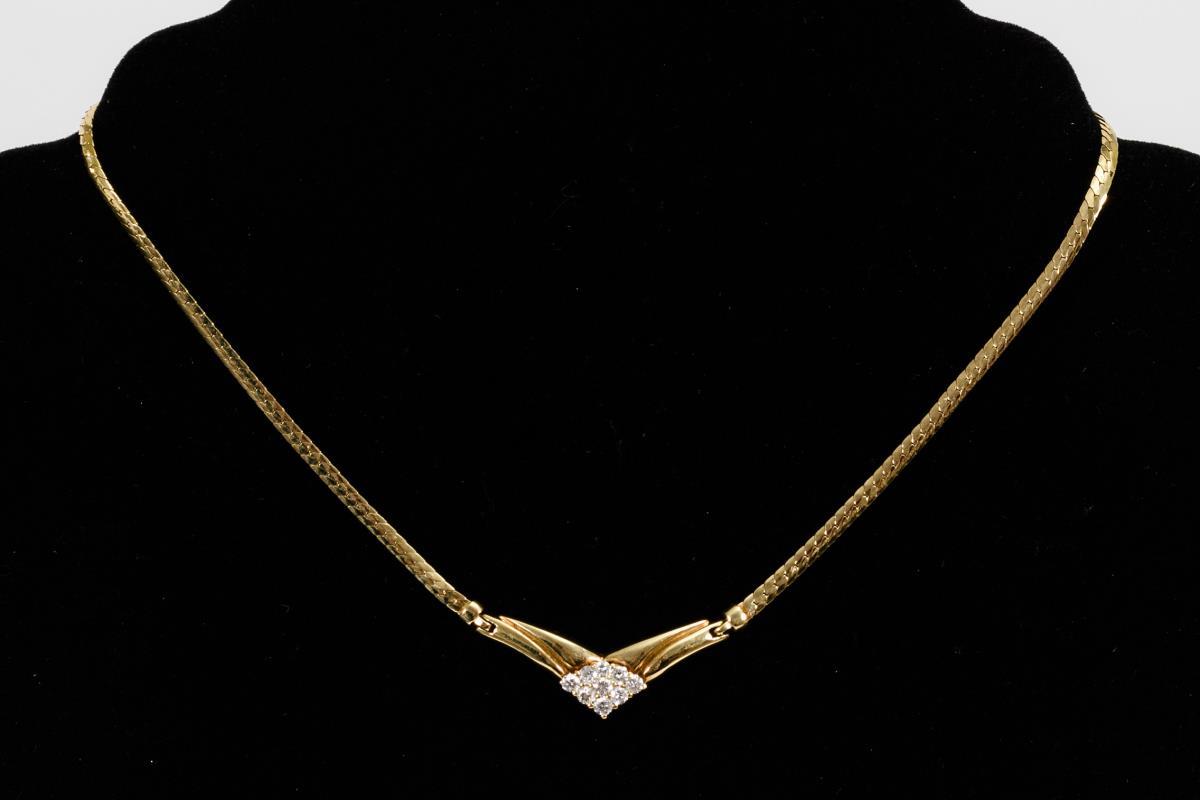 585 GG. 10,86 g. Reliefiertes Mittelteil mit 9 chatongefassten Steinen (zus. ca. 0,75 ct/G-H/si), zwischen flacher Panzerkette. Karabinerschloss. L 42,5 cm. G Wertermittlung laut Gutachten von 2018: 4.760,00 Euro..