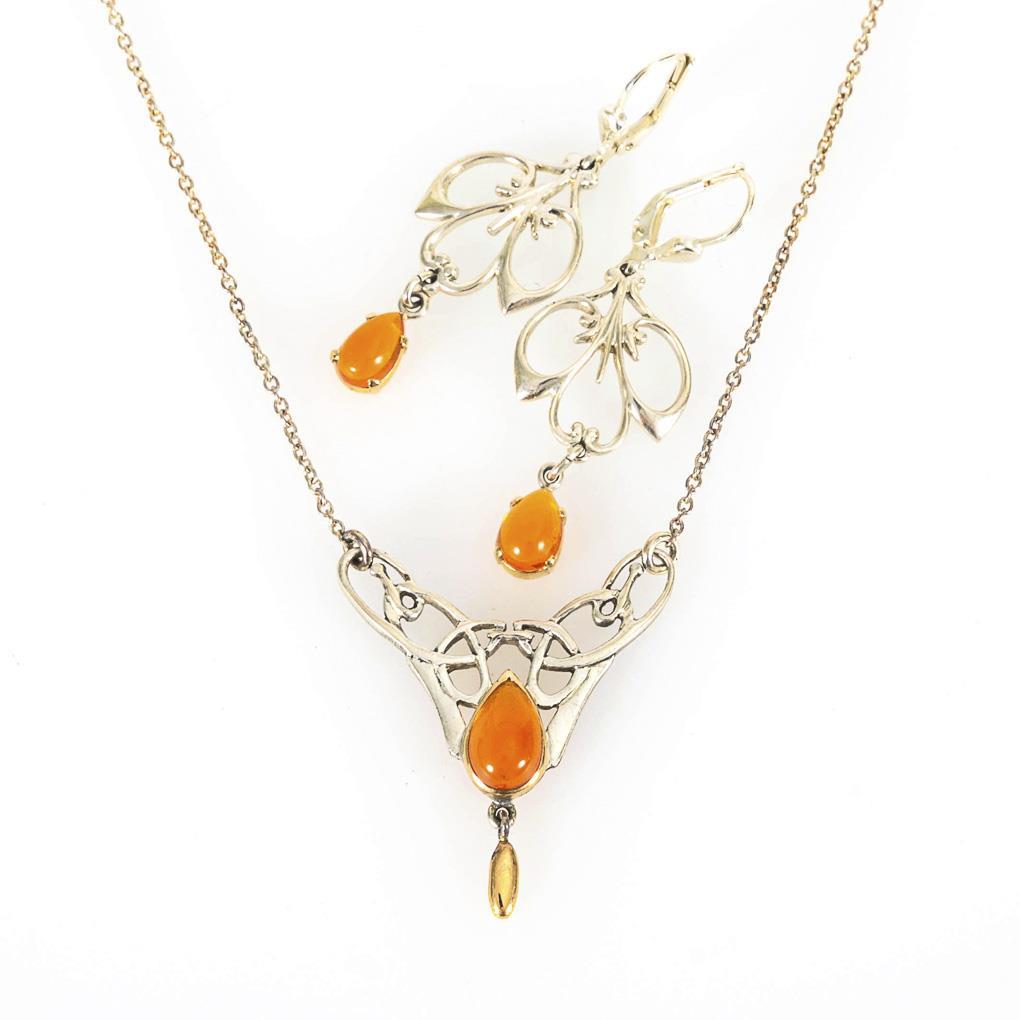 Center ornament with bezel-set fire opal between anchor chain with lobster clasp. Matching pair of earrings with spring clip.
