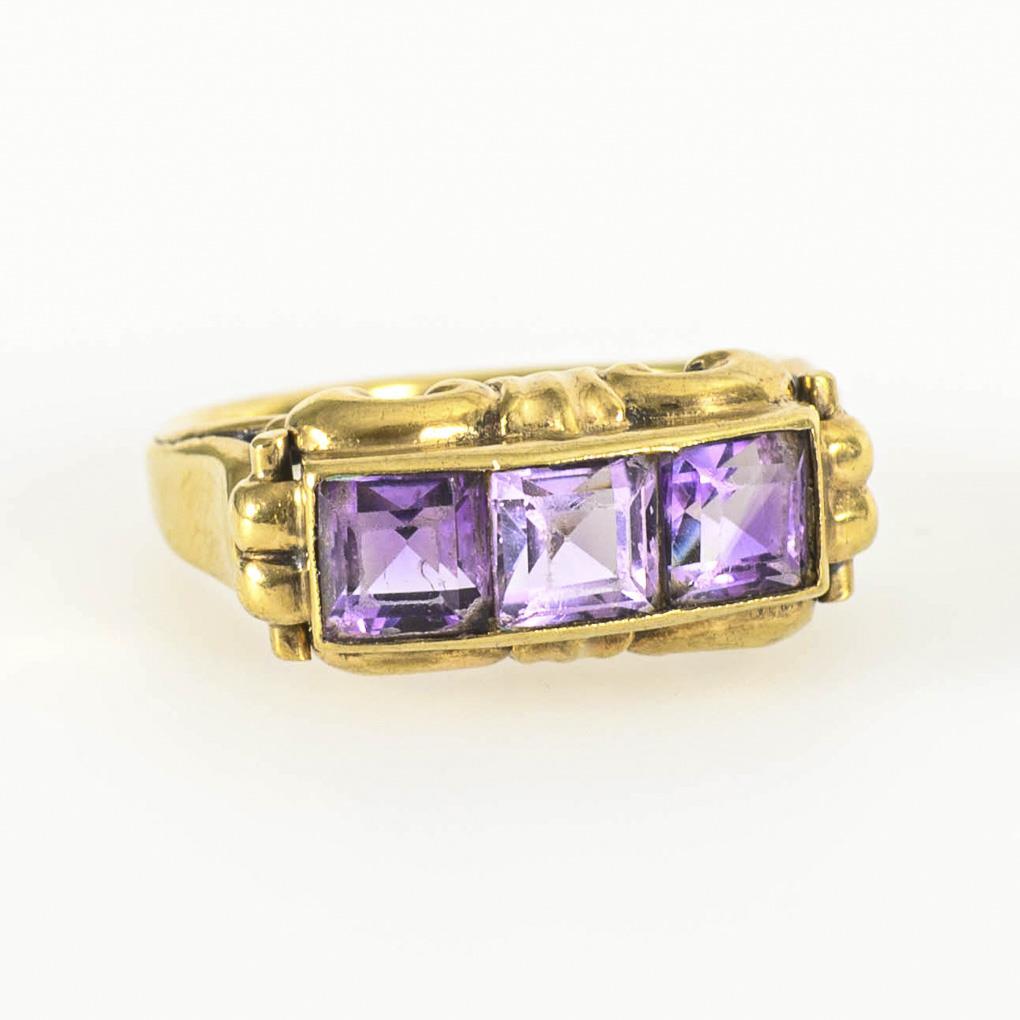 3 bezel-set amethysts in relief ring head between narrow shank.