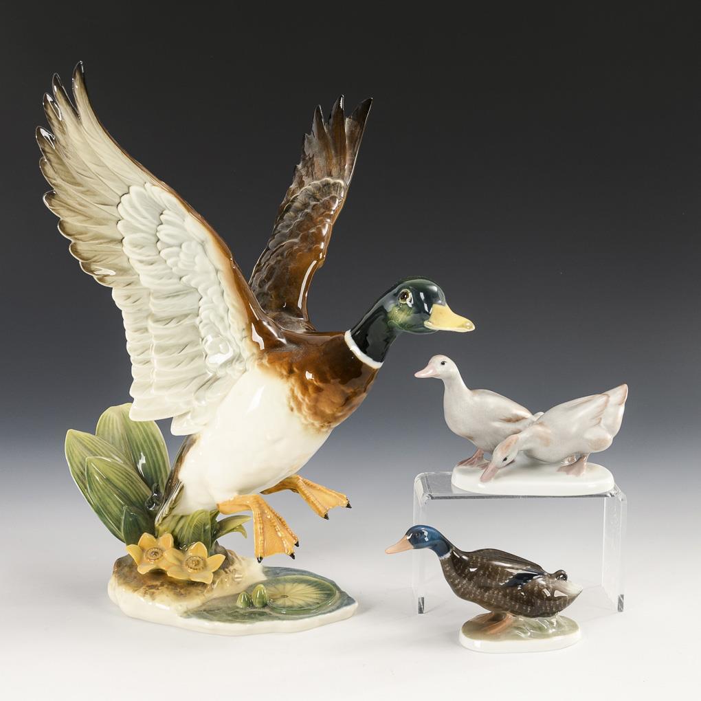 2x ROSENTHAL, 1916 and 1918, design by Karl Himmelstoß (1872-1967): pair of ducks (H 7.5 cm) and drake (H 6.5 cm). / 1x HUTSCHENREUTHER, from 1970, design by Uwe Netzsch (*1944): drake (H 30 cm).