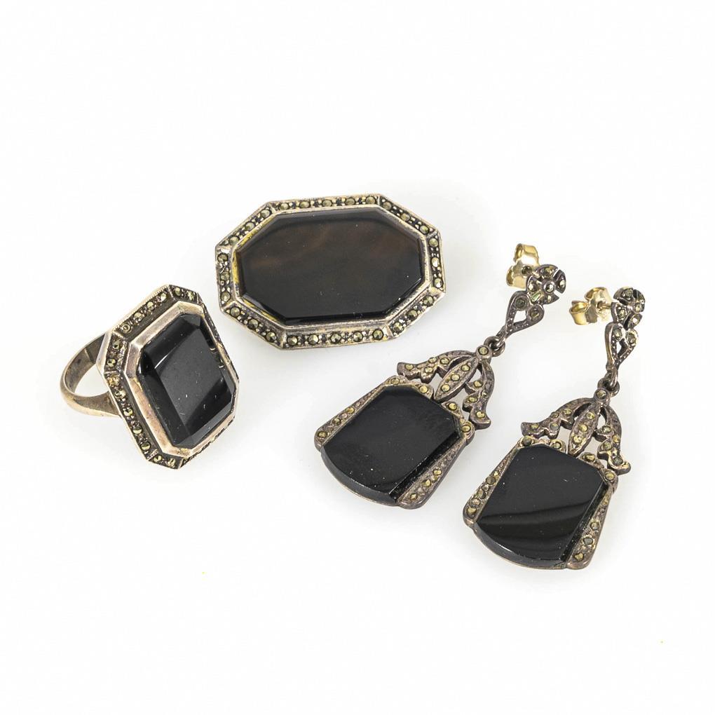 Brooch, ring and pair of ear studs with onyx inlays and marcasite setting. Ball hook, central ring bar, pin mechanism.