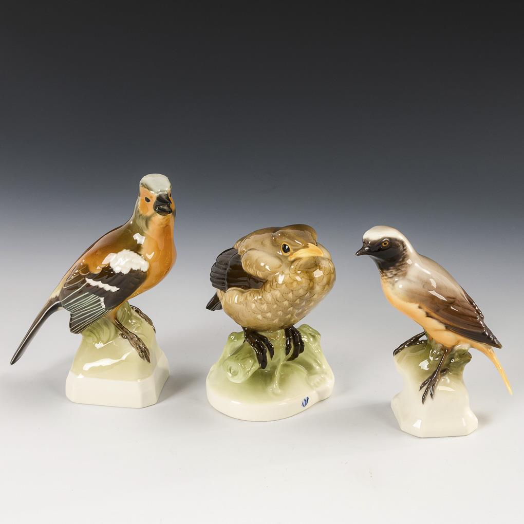 1x model no. 458, design 1909 by Christian Wittmann (1871-1958): Blackbird chick (h 11.5 cm). / 1x model no. 383, design 1913 by Theodor Kärner (1884-1966): Chaffinch (H 14 cm). / 1x model no. 323, design 1911 by Theodor Kärner: Redstart (H 11.5 cm).