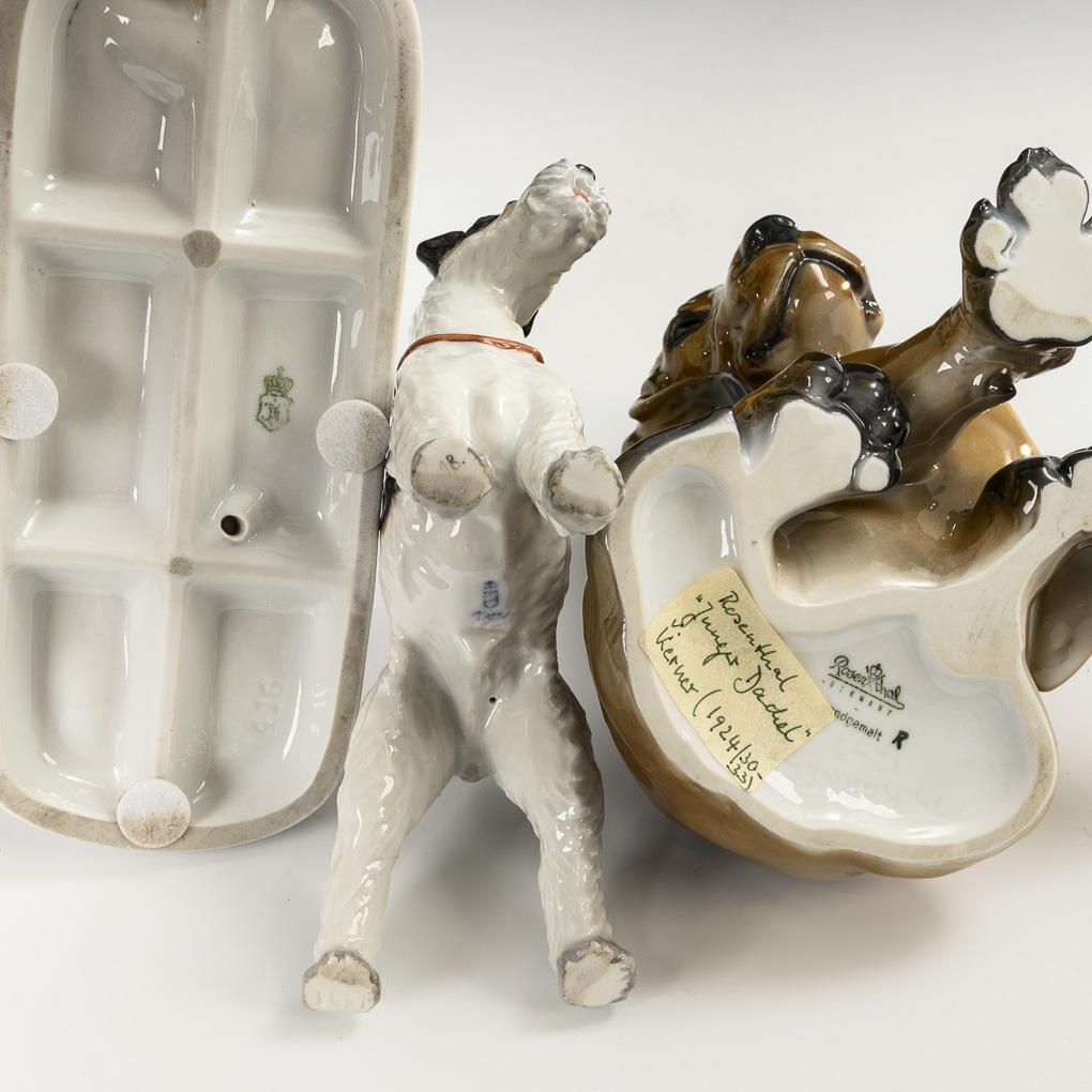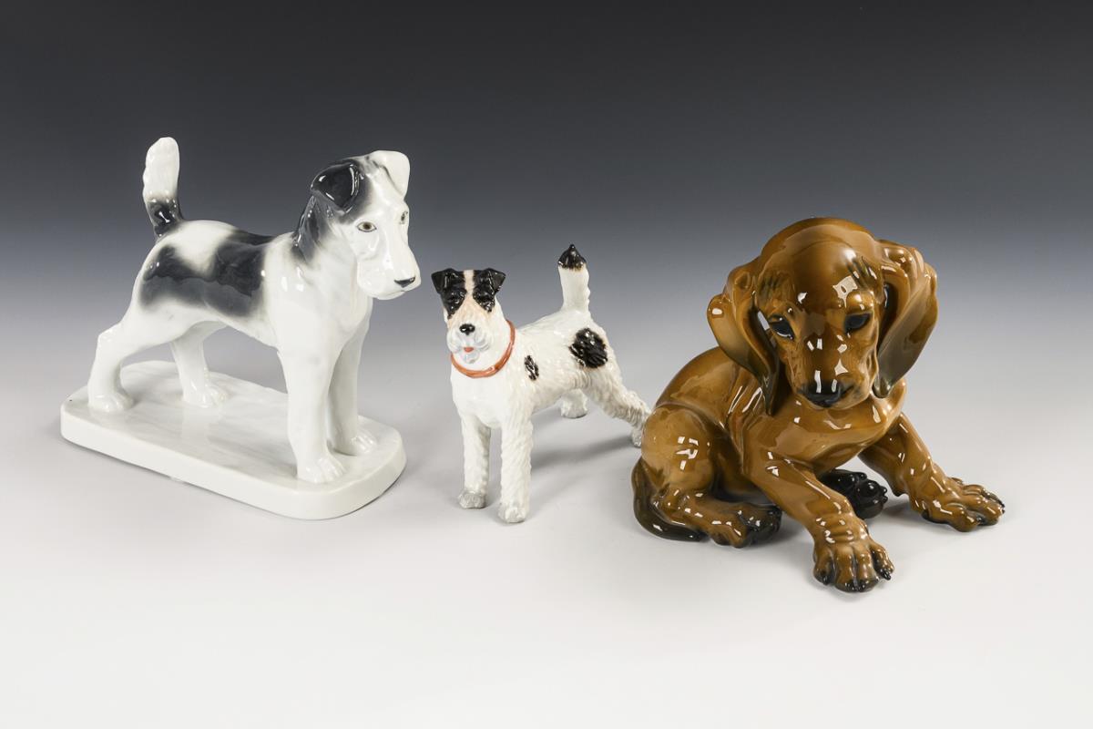 1x GALLUBA & HOFMANN, model no. 416: Fox terrier (H 17.5 cm). / 1x ROSENTHAL, model no. 1247, design 1933 by Theodor Kärner (1884-1966) (H 15.5 cm). / 1x AUGARTEN: Fox terrier (H 12.5 cm).