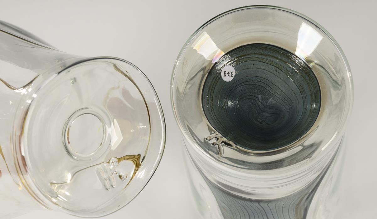 1x vase object made of clear and petrol-colored glass with raised base (H 22.5 cm). / 1x drop-shaped glass object made of colorless and amber-colored glass (H 22 cm).