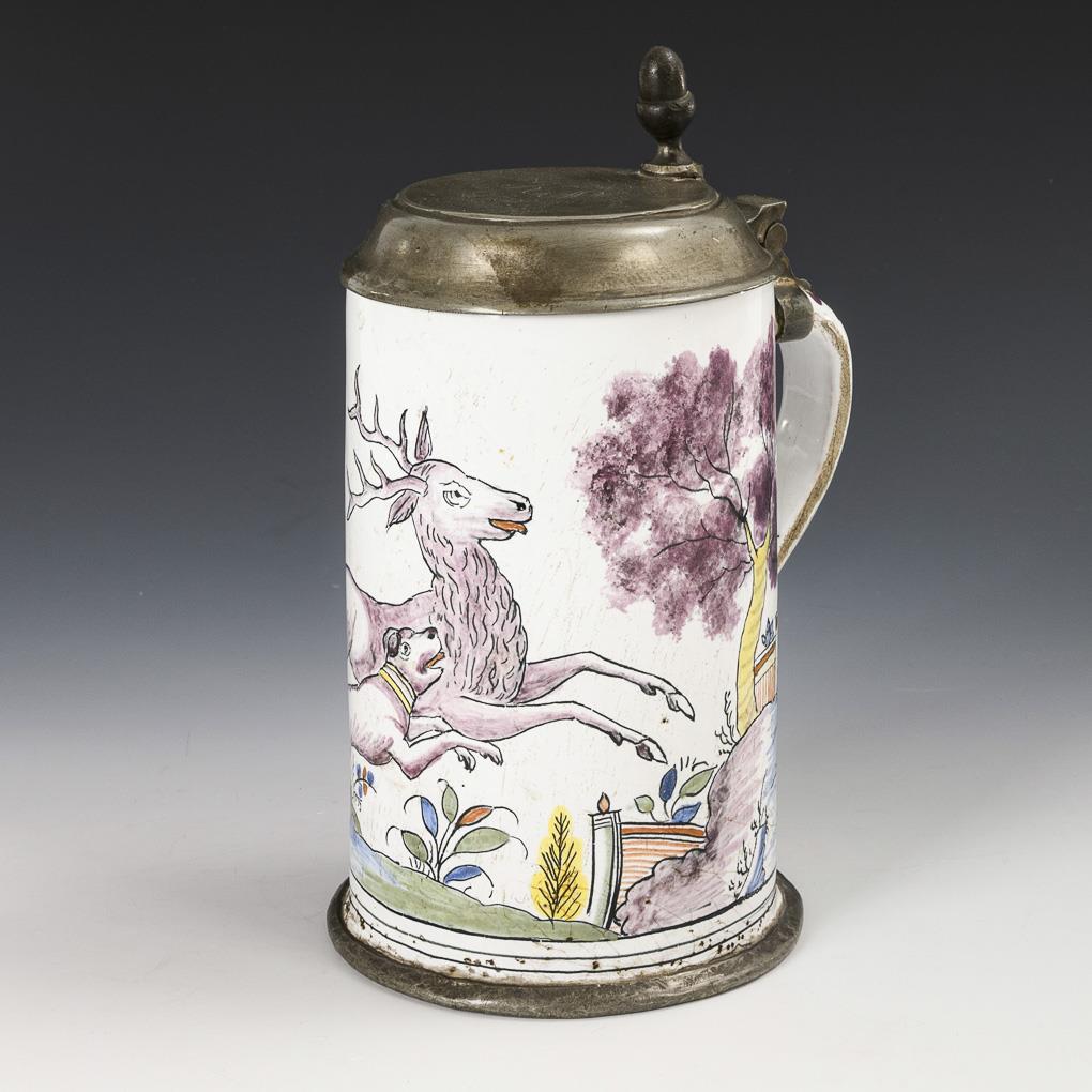 Baroque faience tankard with hunting motif.