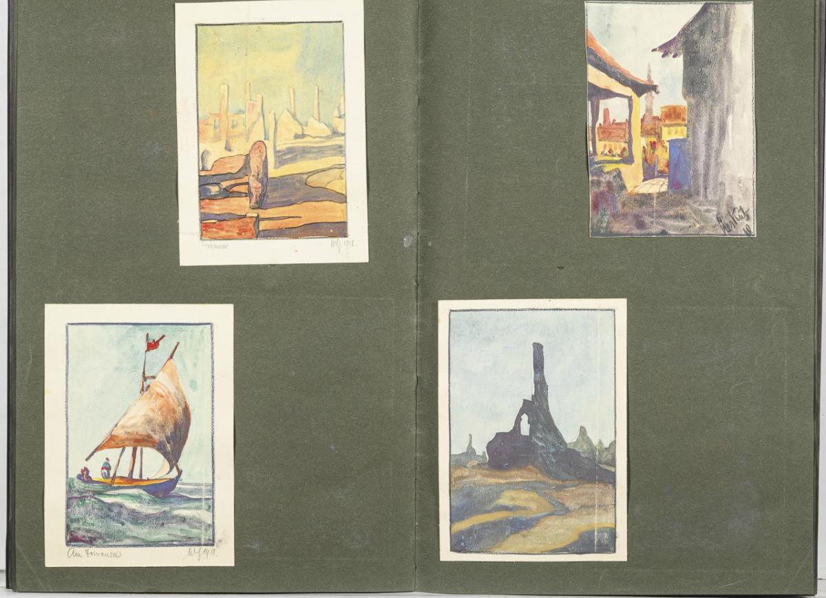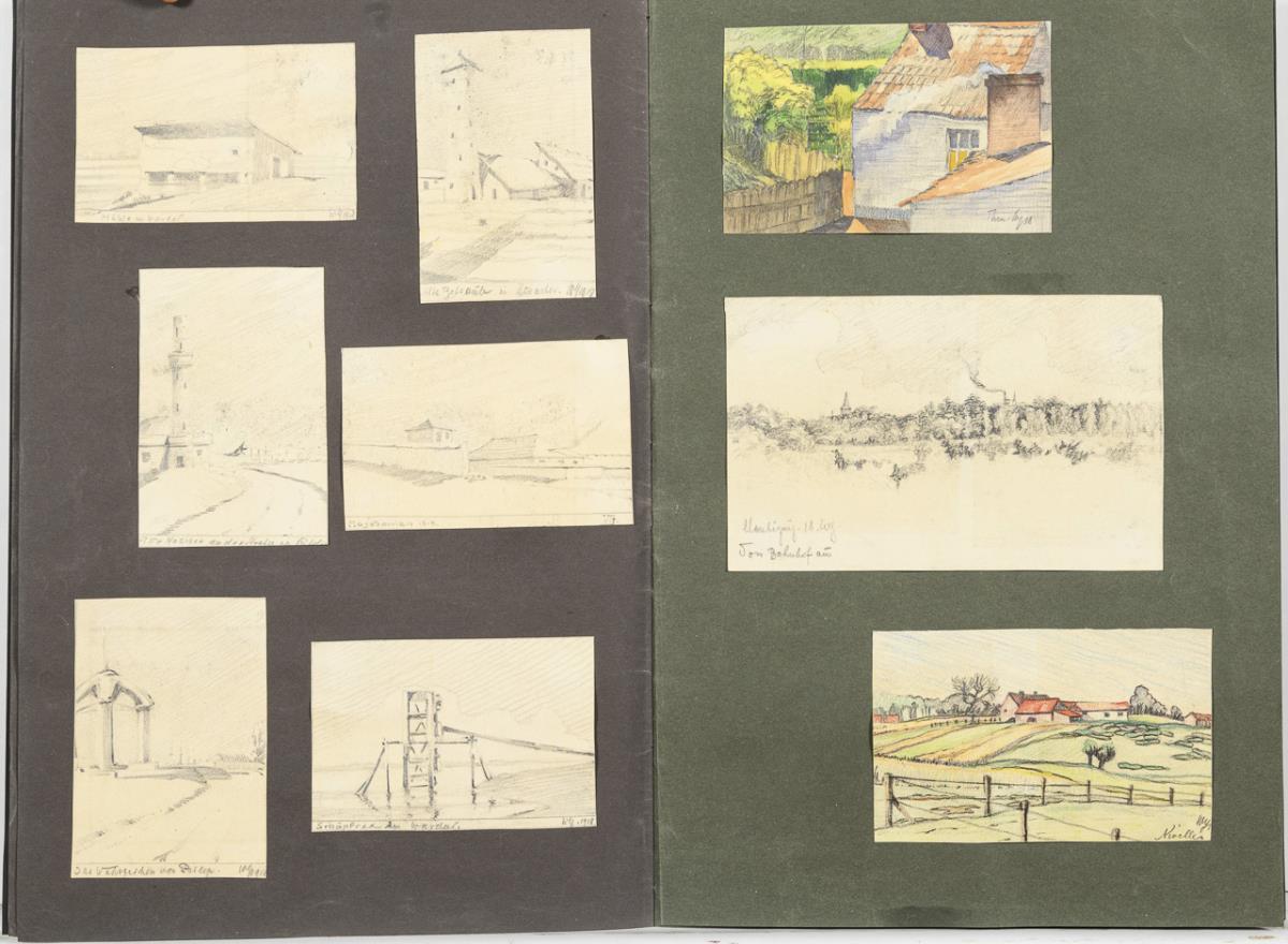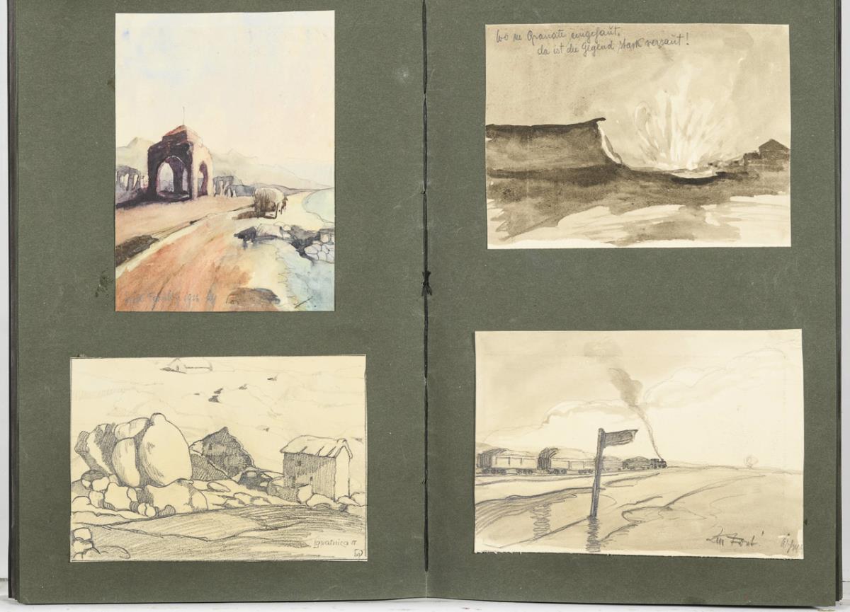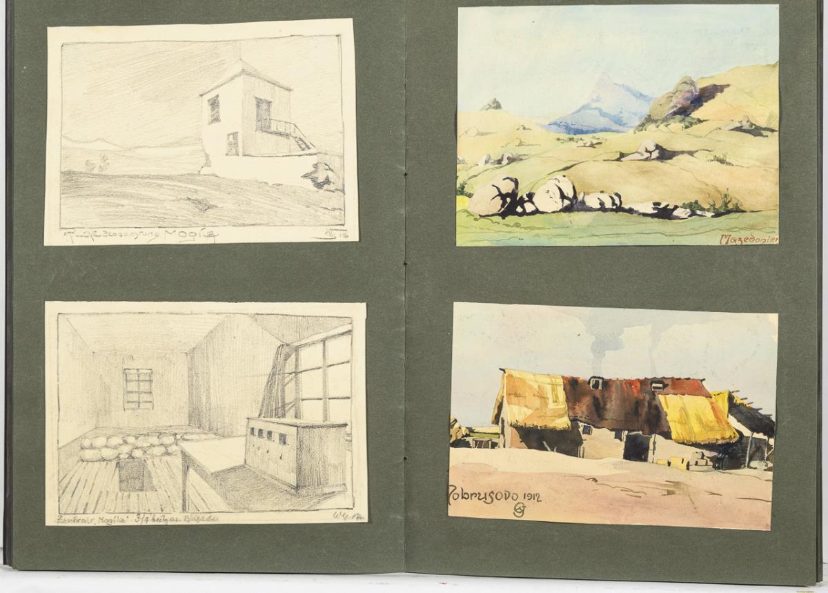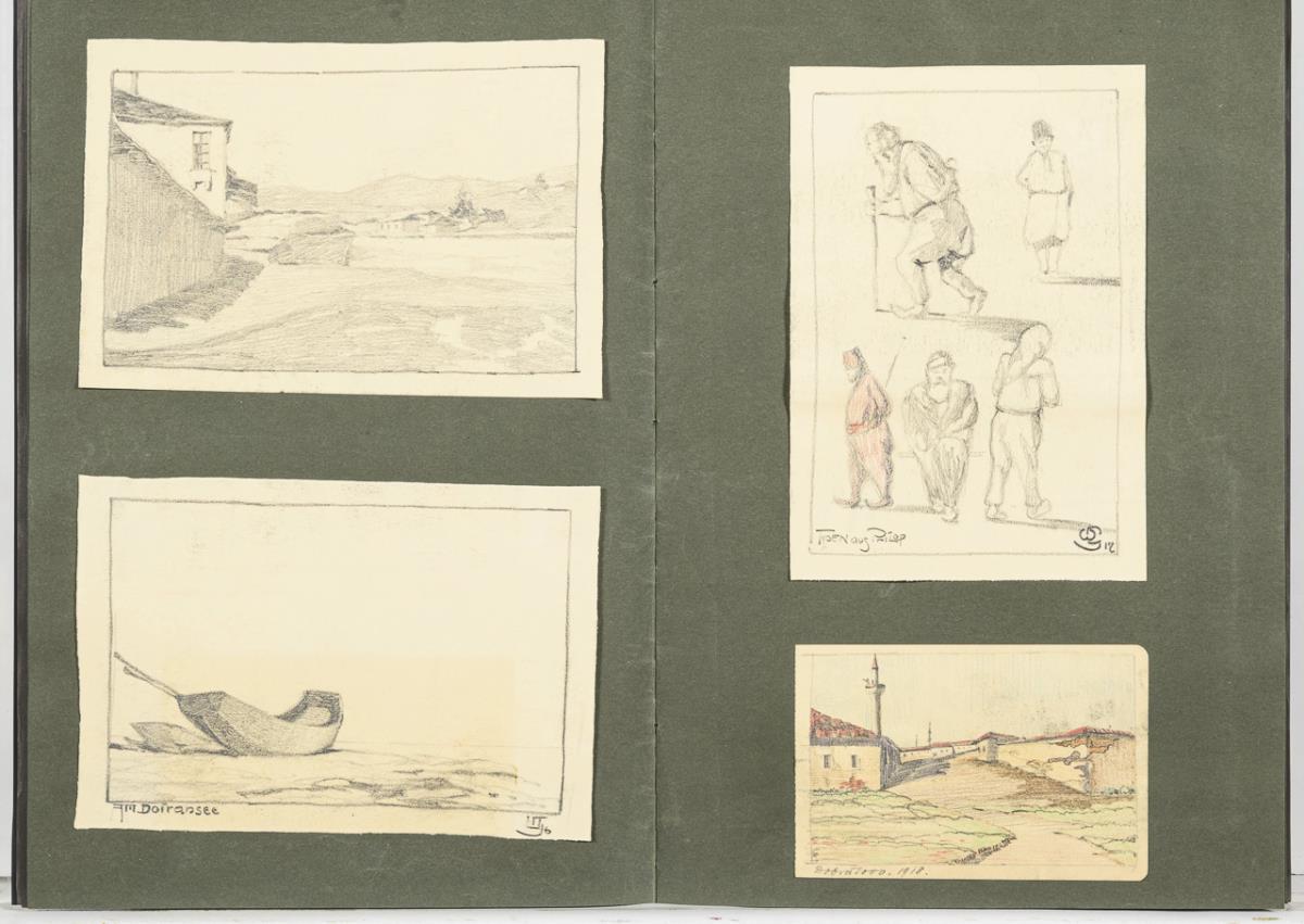 Collection of 81 sketches and watercolors from the years 1916 to 1918, partly earlier, in various formats, each monogrammed, dated and with location, mainly landscapes, mostly views of small villages, towns or isolated buildings in Macedonia and France; partly trimmed. In modern portfolio. Slightly stained, visible adhesive residue.