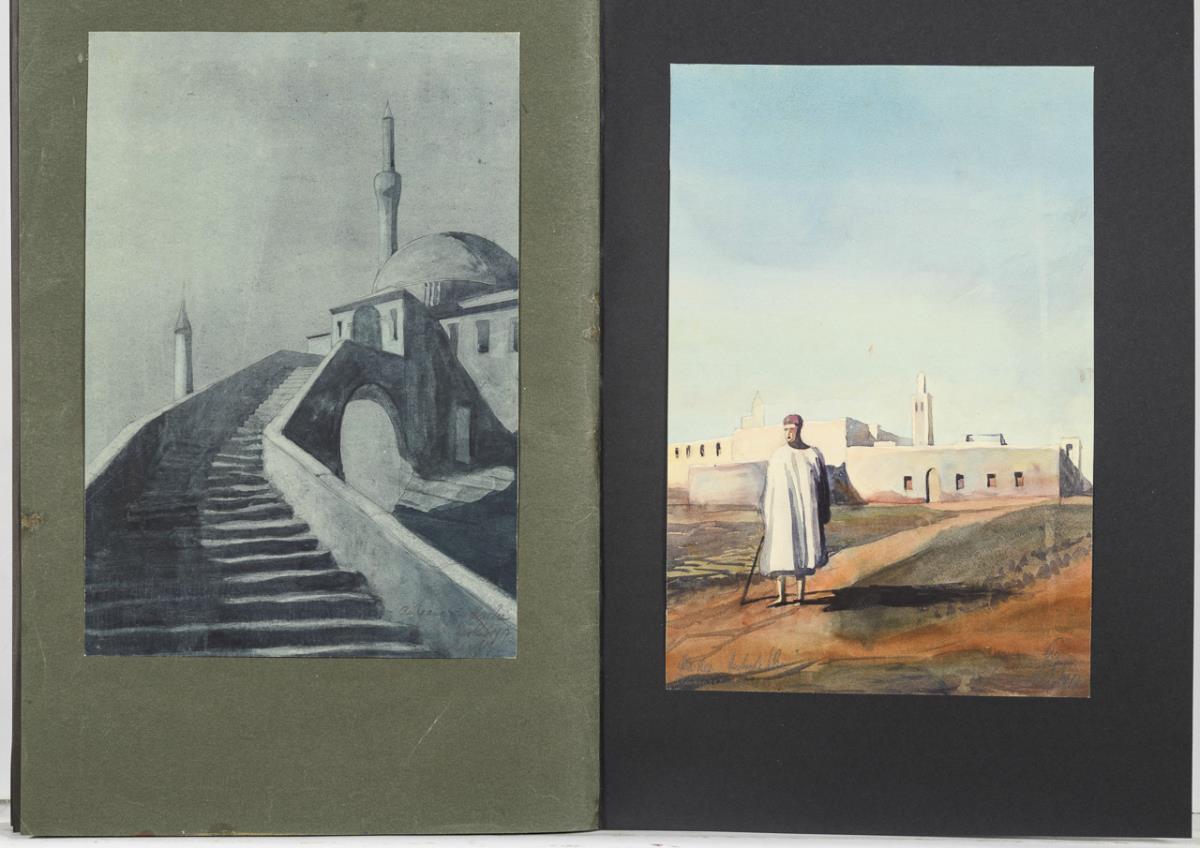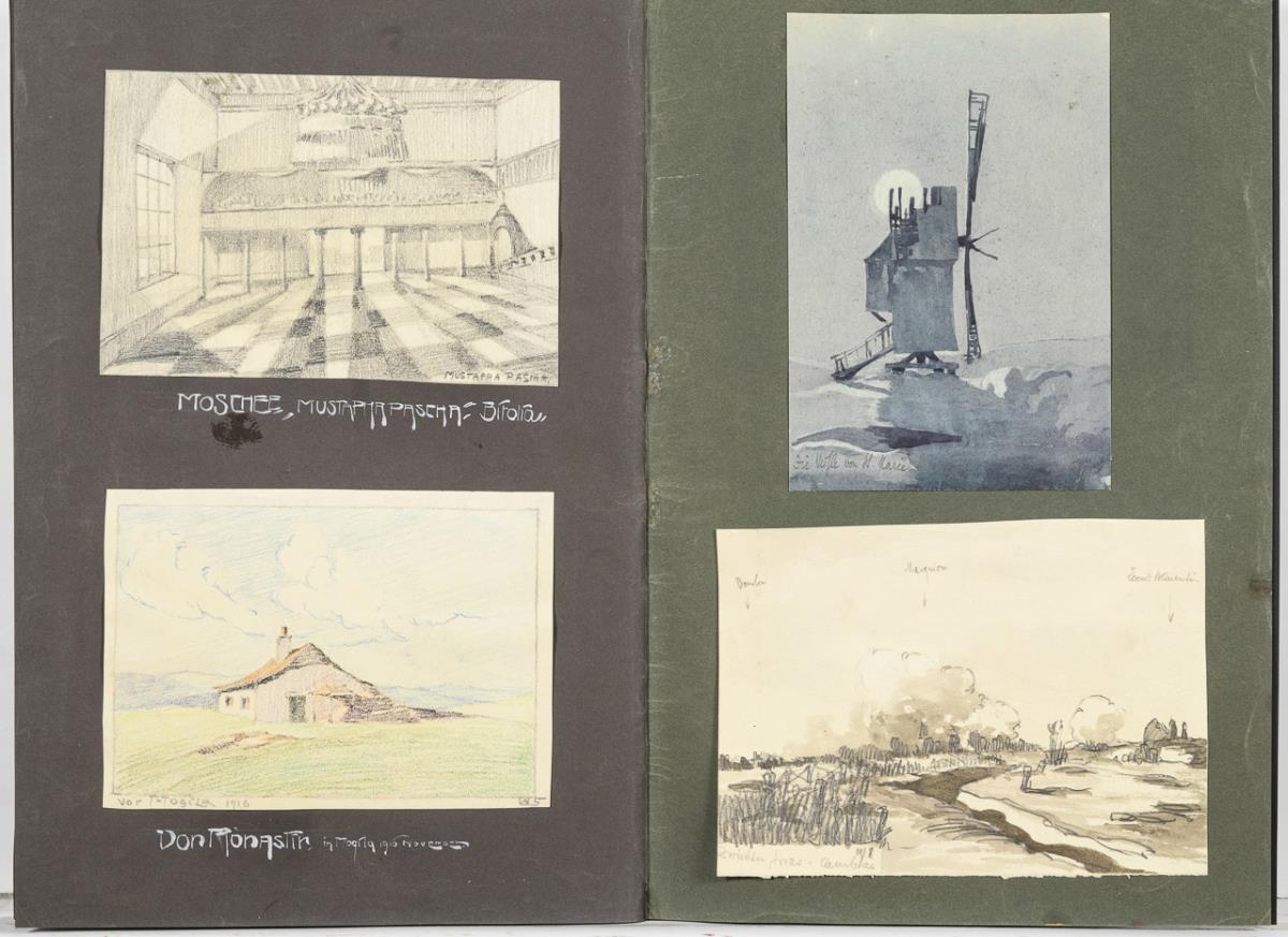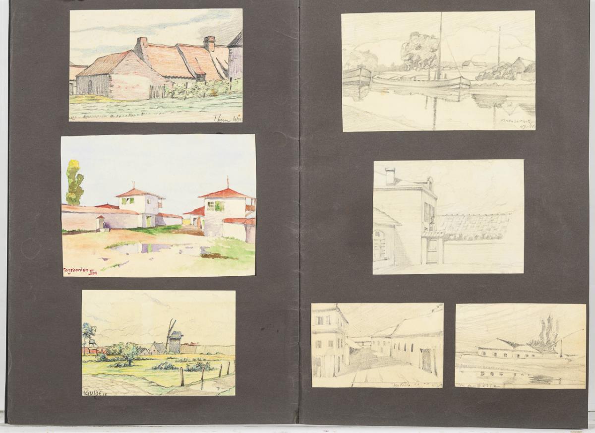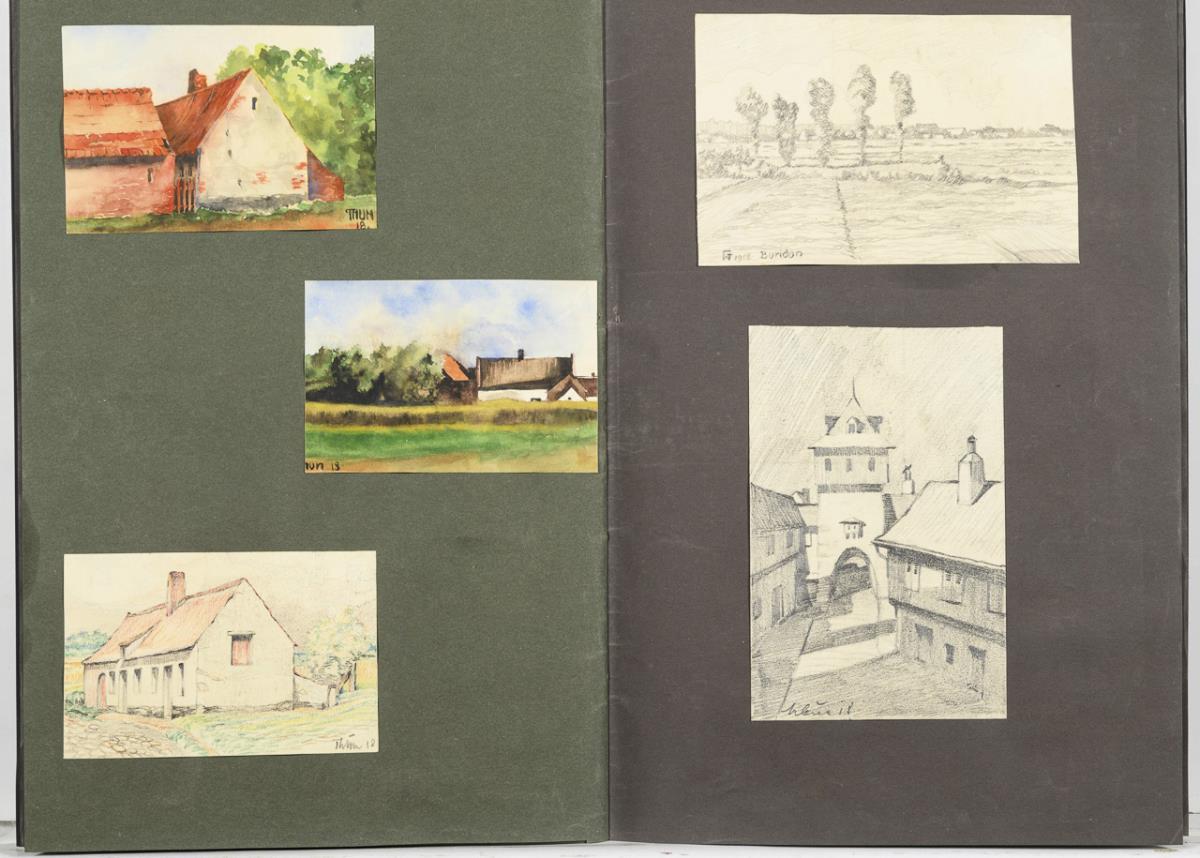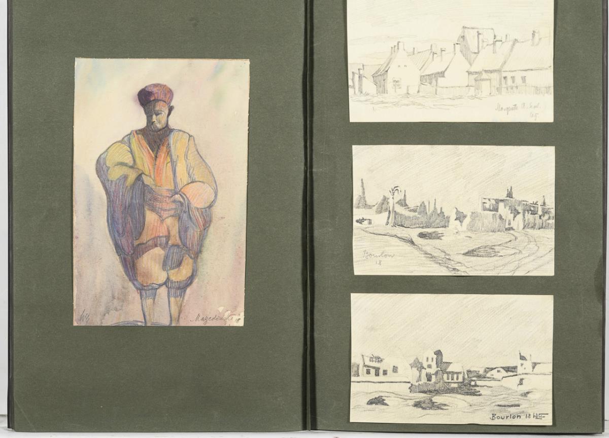 Collection of 81 sketches and watercolors from the years 1916 to 1918, partly earlier, in various formats, each monogrammed, dated and with location, mainly landscapes, mostly views of small villages, towns or isolated buildings in Macedonia and France; partly trimmed. In modern portfolio. Slightly stained, visible adhesive residue.