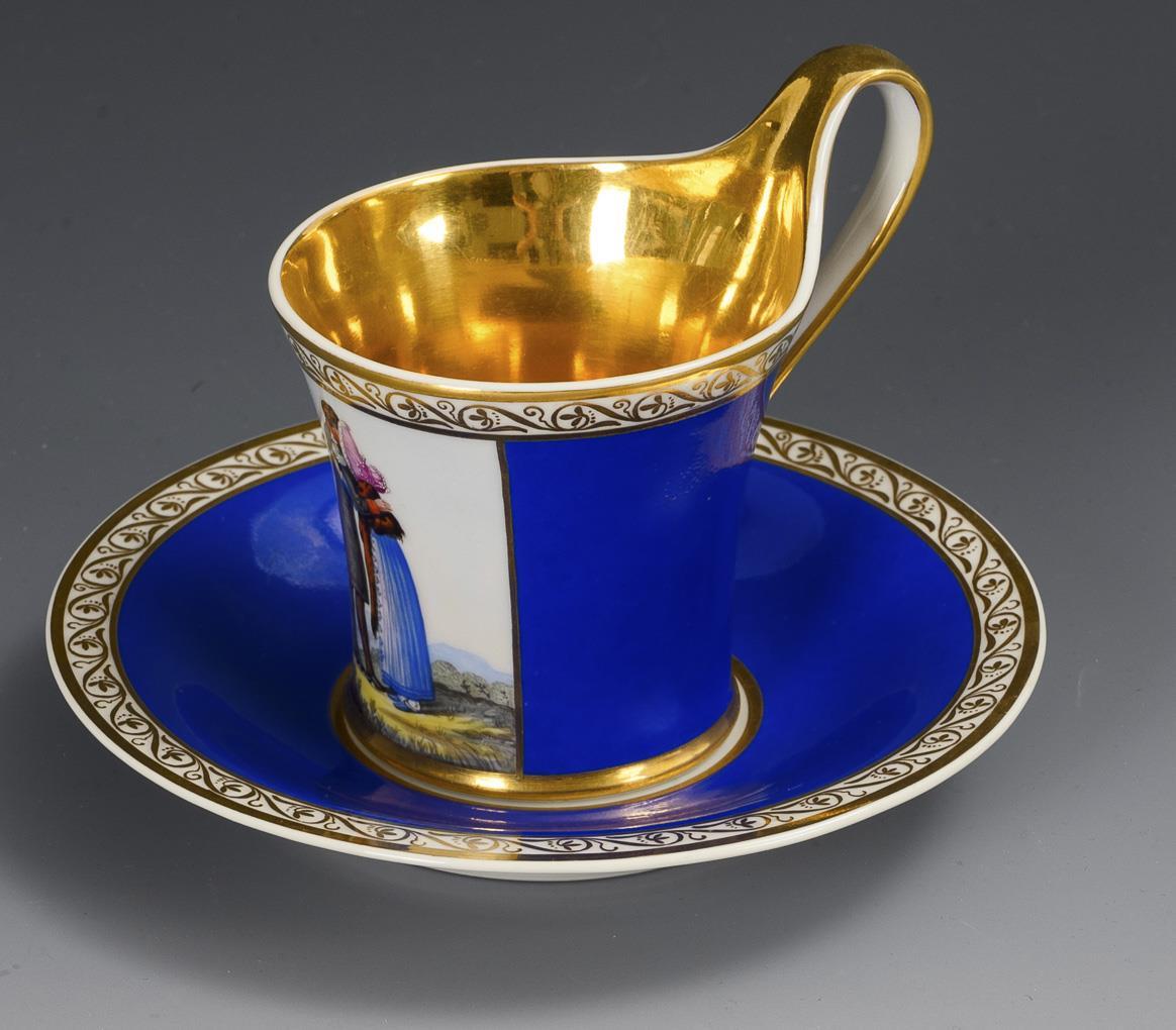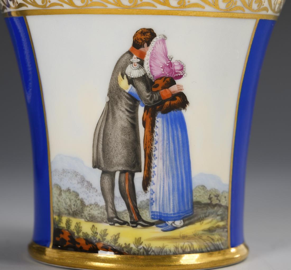 Crater shape with campanile handle. The front with a gold-framed rectangular cartouche depicting a Biedermeier couple embracing in a landscape, verso with blue ground, vegetal gold border, gilt interior, the mirror of the saucer with the rubbed greeting "Guten Morgen!".