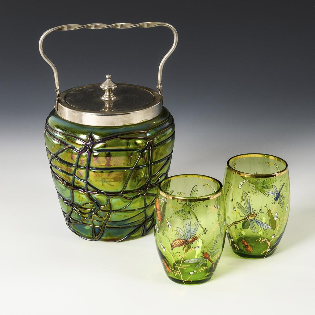 1x ELISABETH, c. 1900: green glass baluster jar, woven with violet thread net, metal-mounted rim with bow handle and knob lid, iridescent (h 23 cm). / 2x early 20th century: convex beaker made of green glass with polychrome enamel-painted insects and gold decoration (h 9.5 cm).
